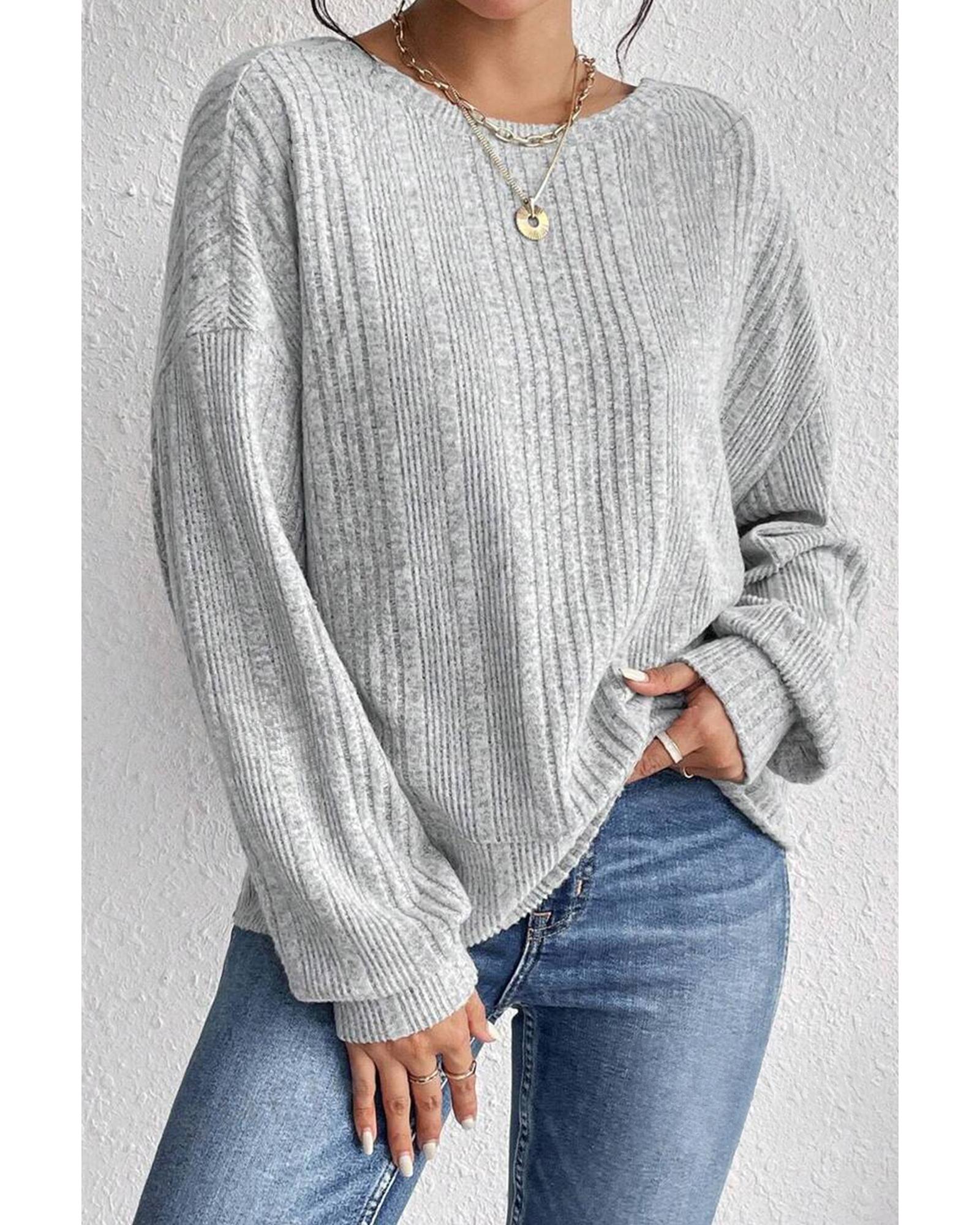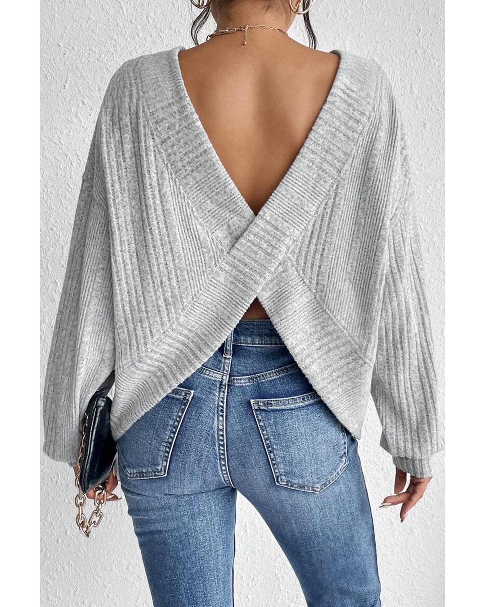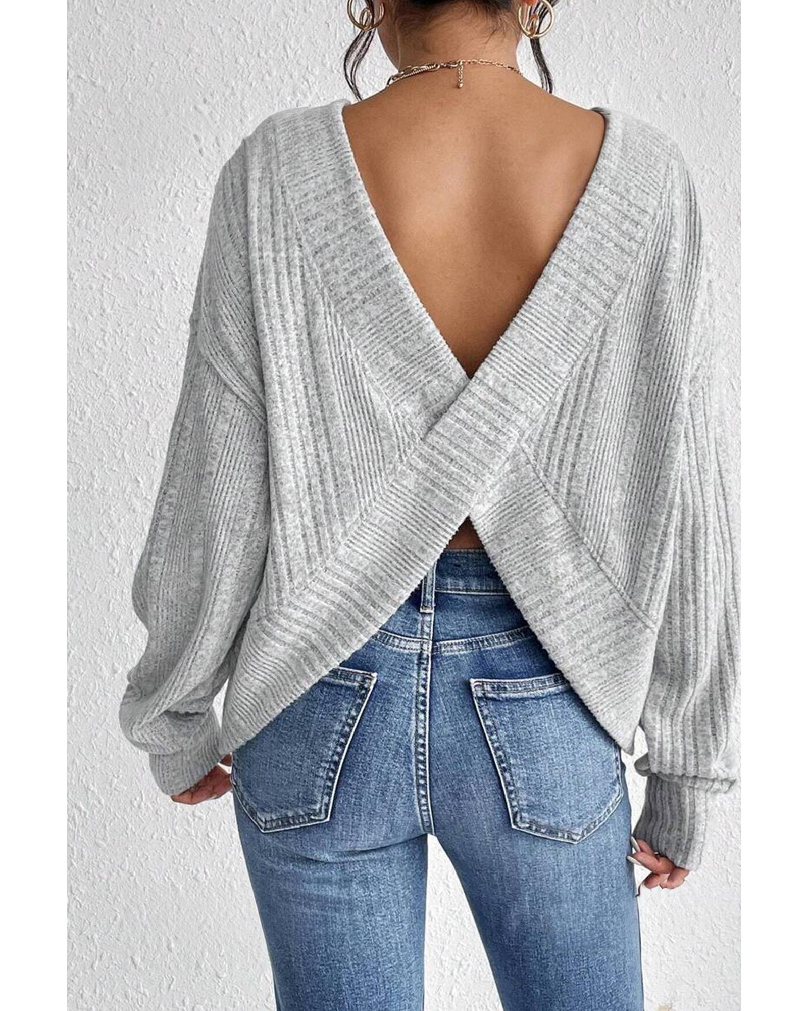Light Grey Textured Crossover Backless Knit Long Sleeve Top – L
