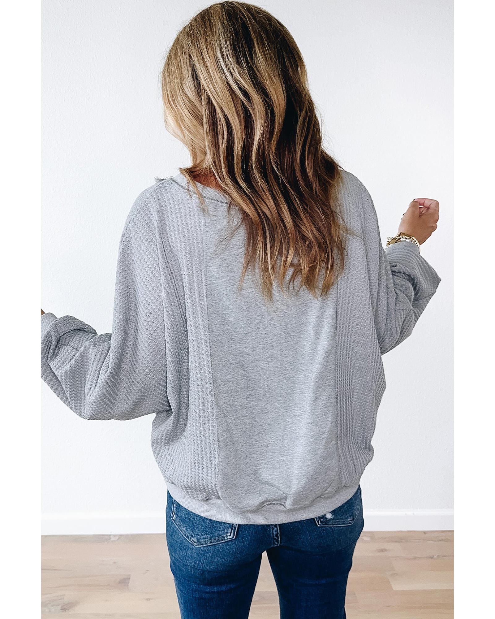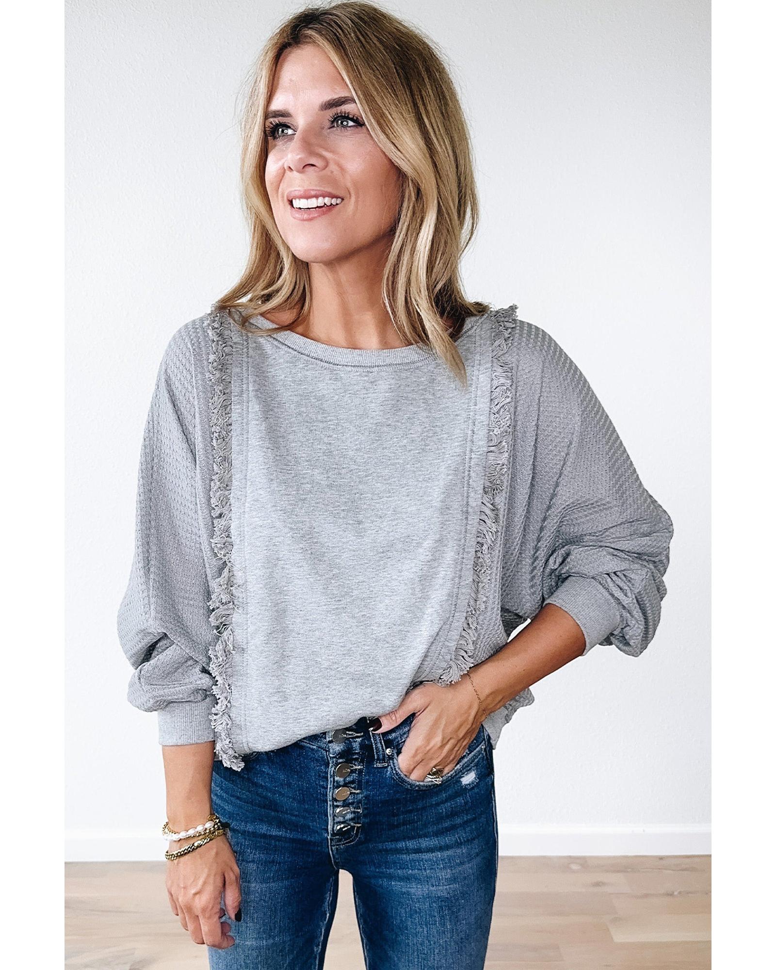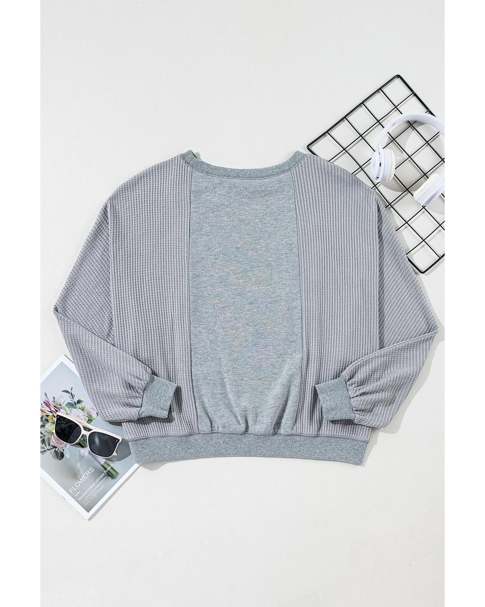 Light Grey Waffle Patchwork Long Sleeve Raw Hem Pullover Top – S