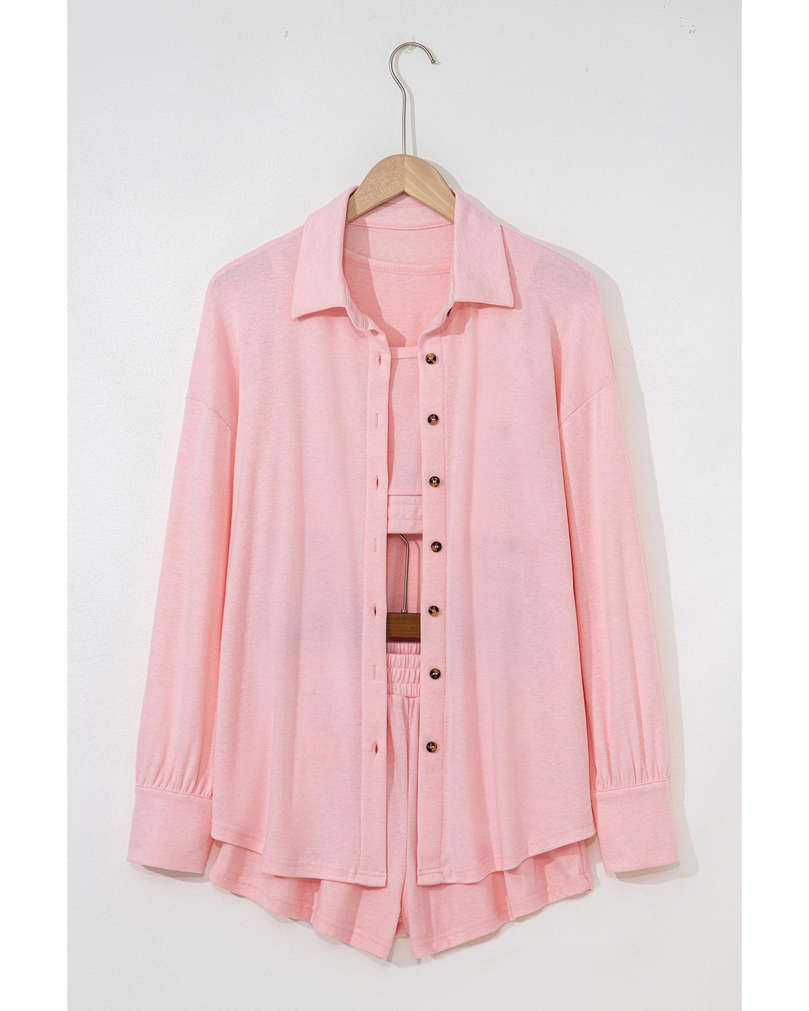 Light Pink 3 Pcs Crop Tank Top Shorts with Cardigan Lounge Set – L
