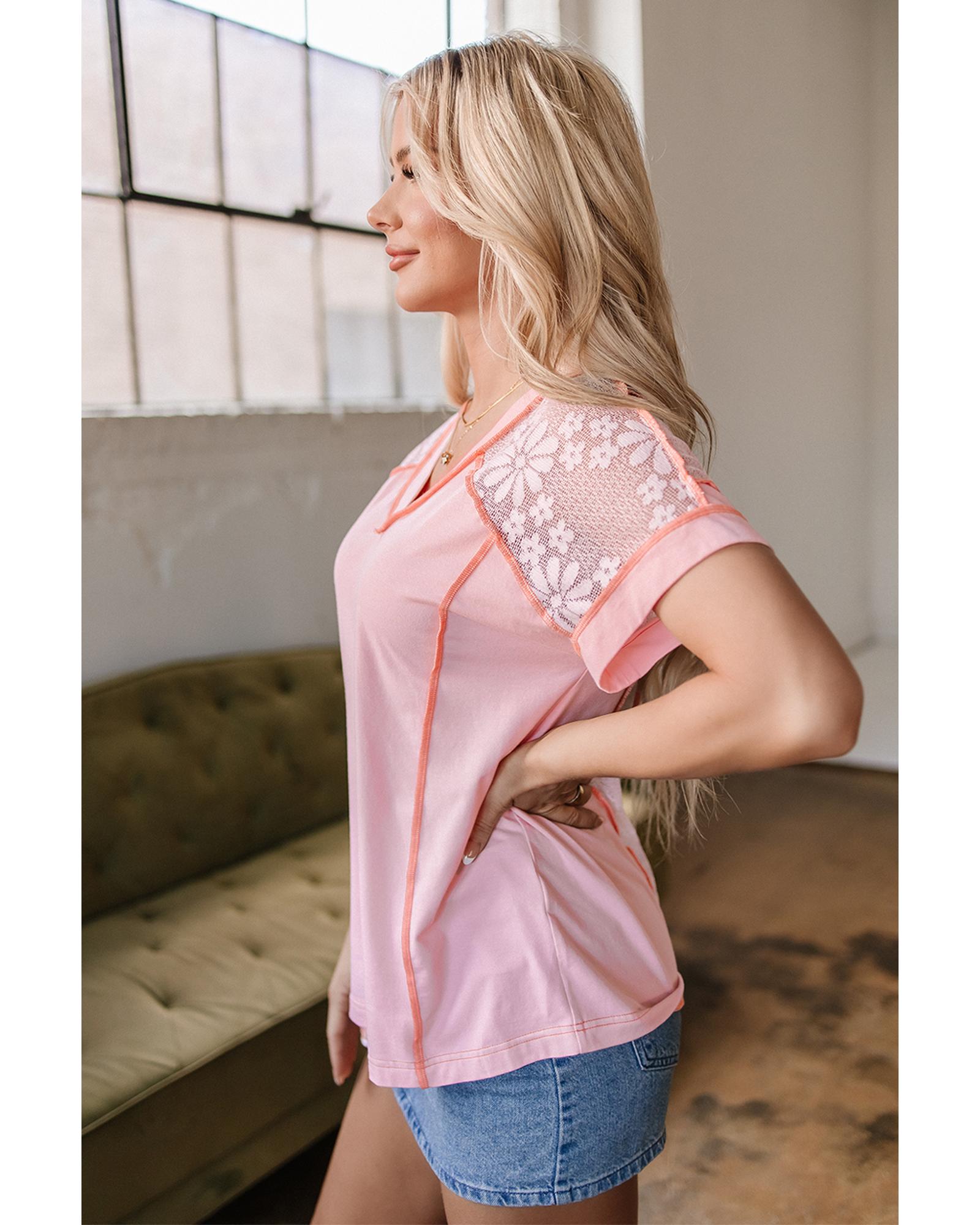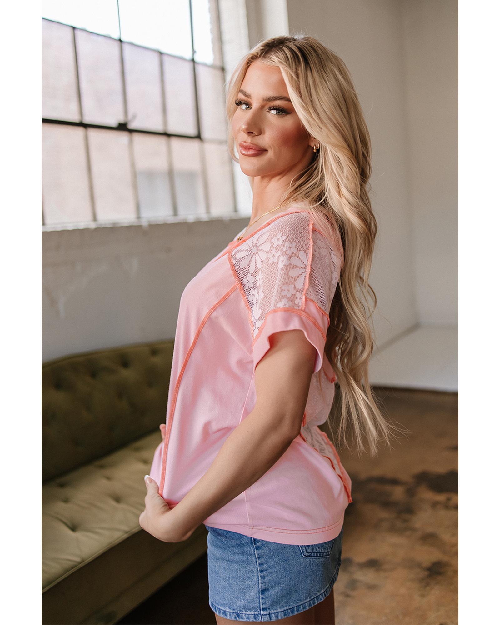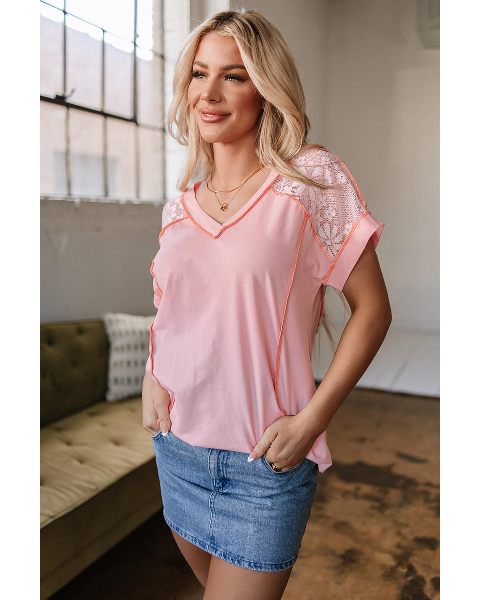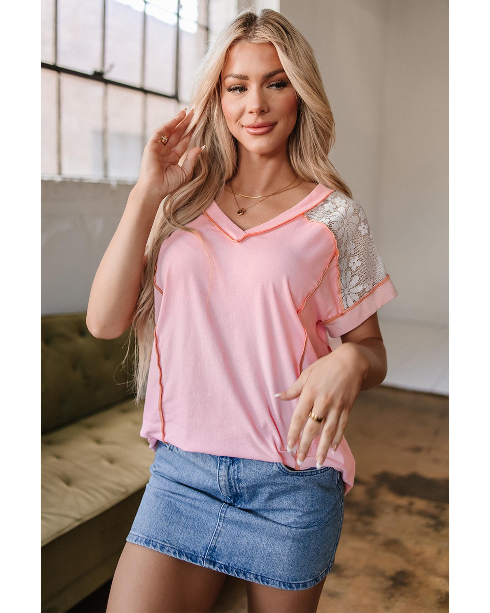 Light Pink Lace Patchwork Exposed Seam V Neck T Shirt – M