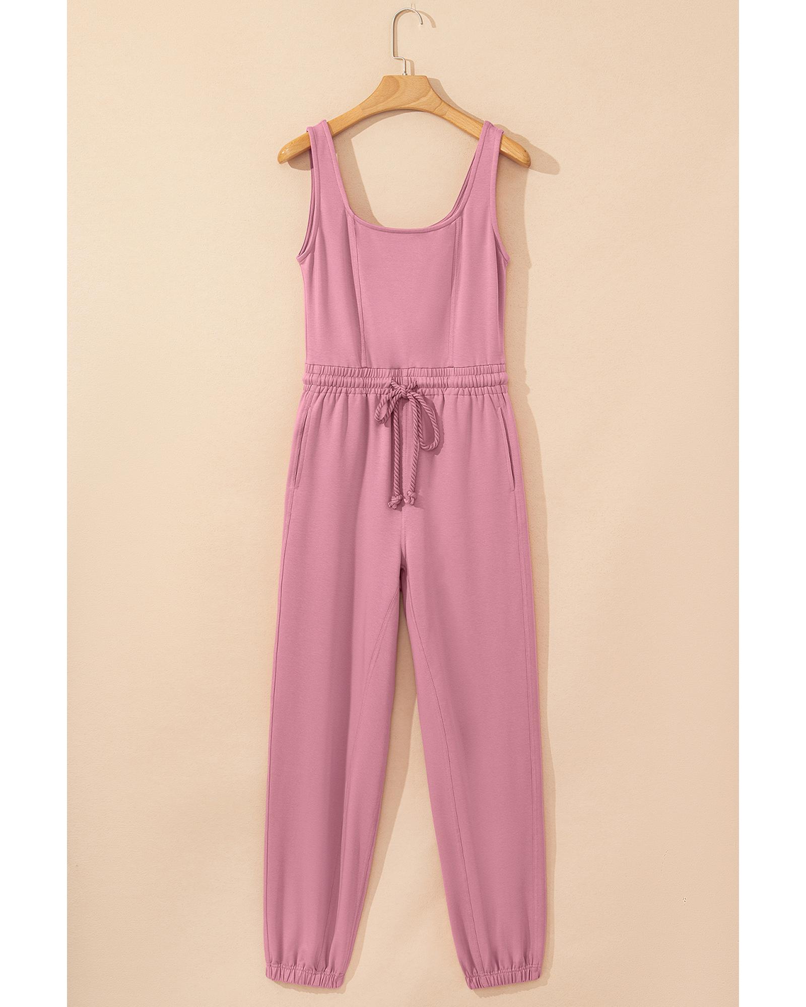 Light Pink Lace-up Elastic Waist Sleeveless Square Neck Jumpsuit – XL