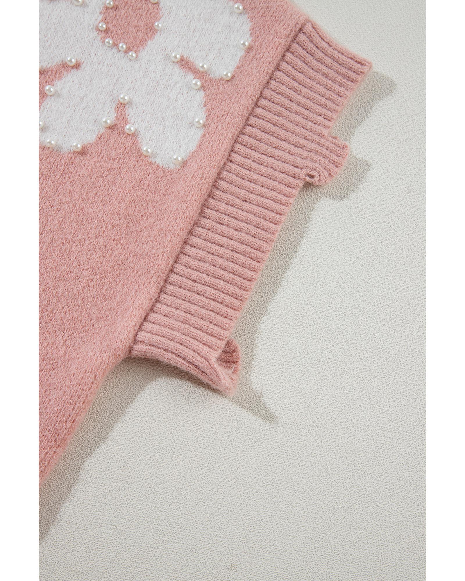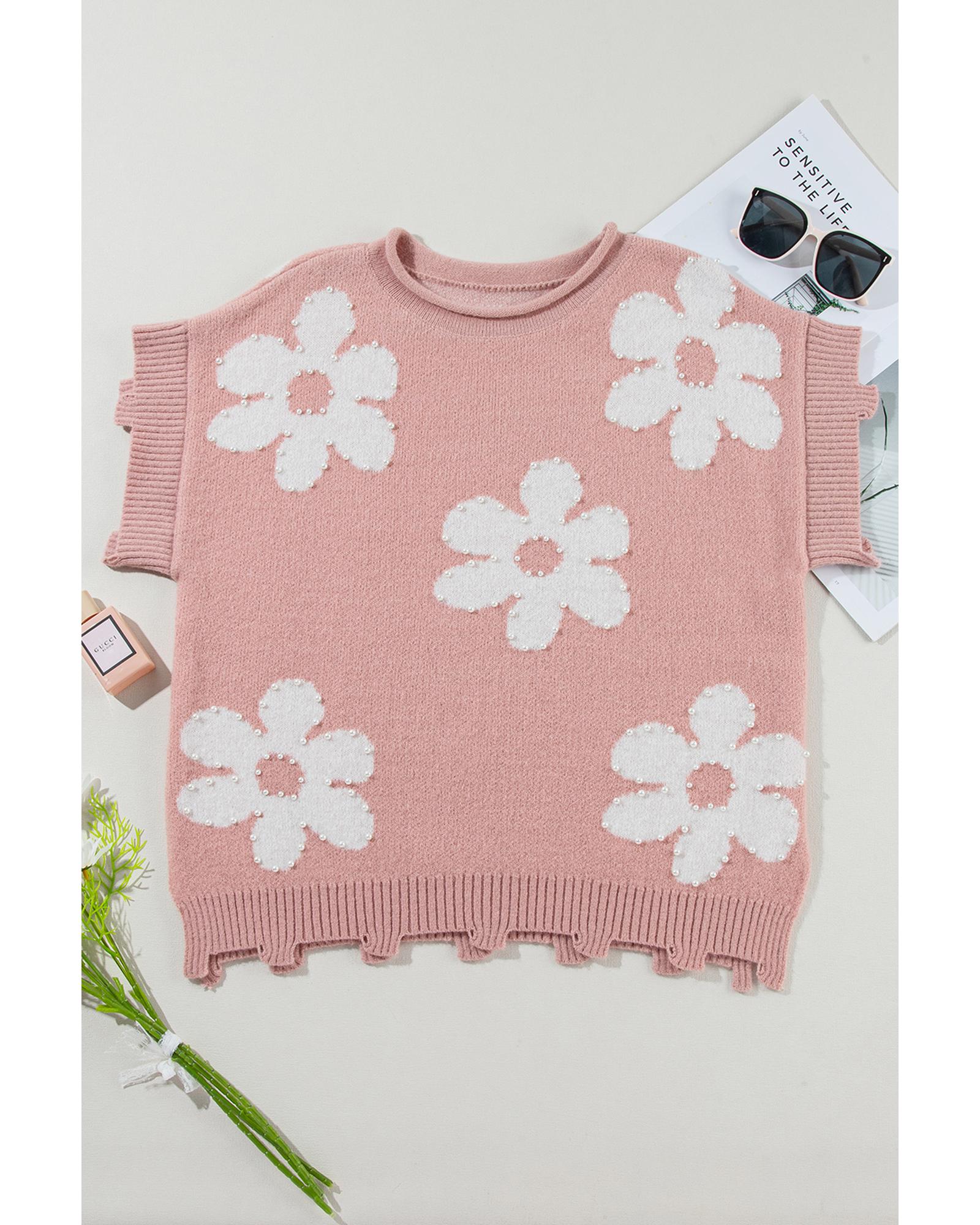 Light Pink Pearled Flower Distressed Edge Sweater T Shirt – L