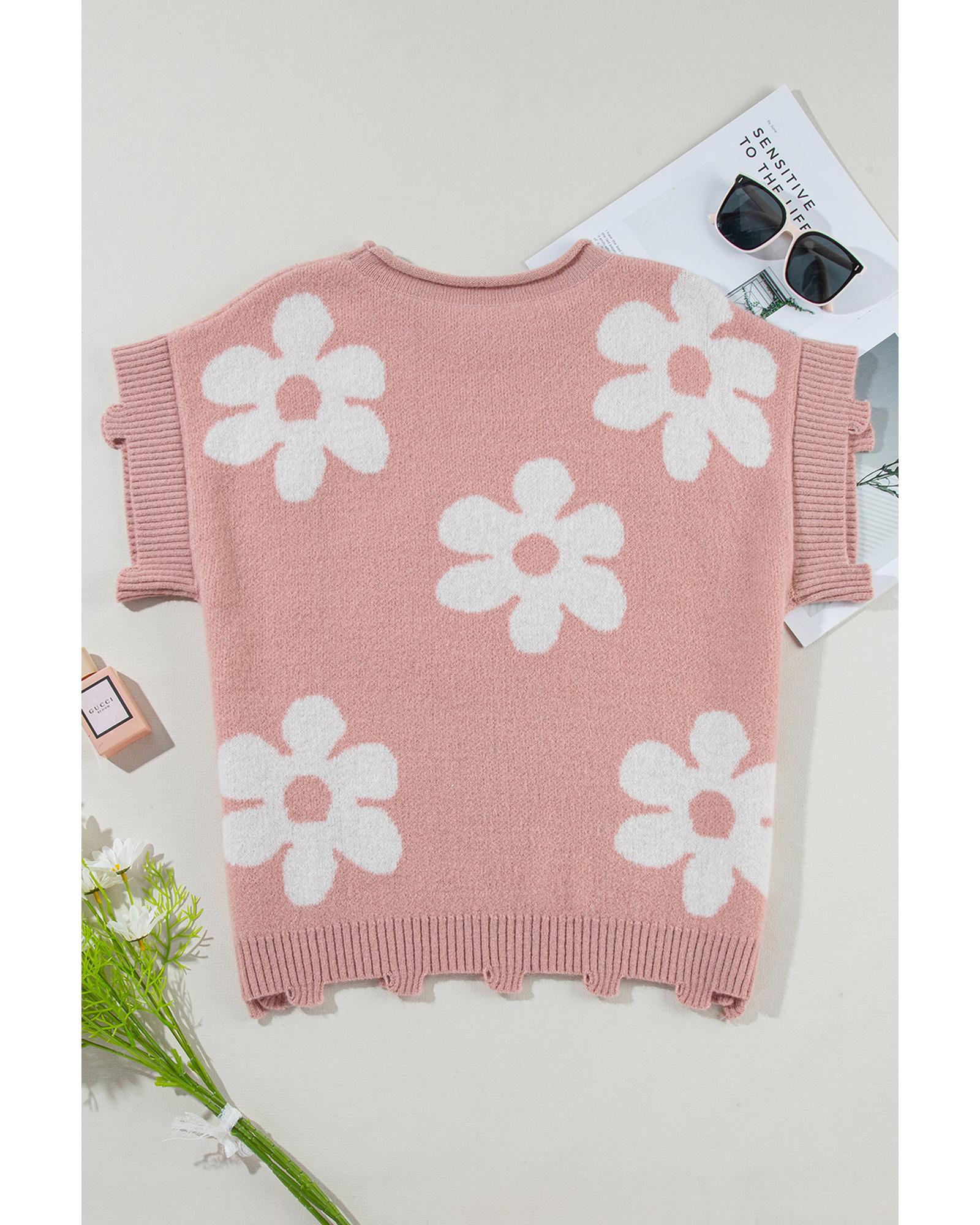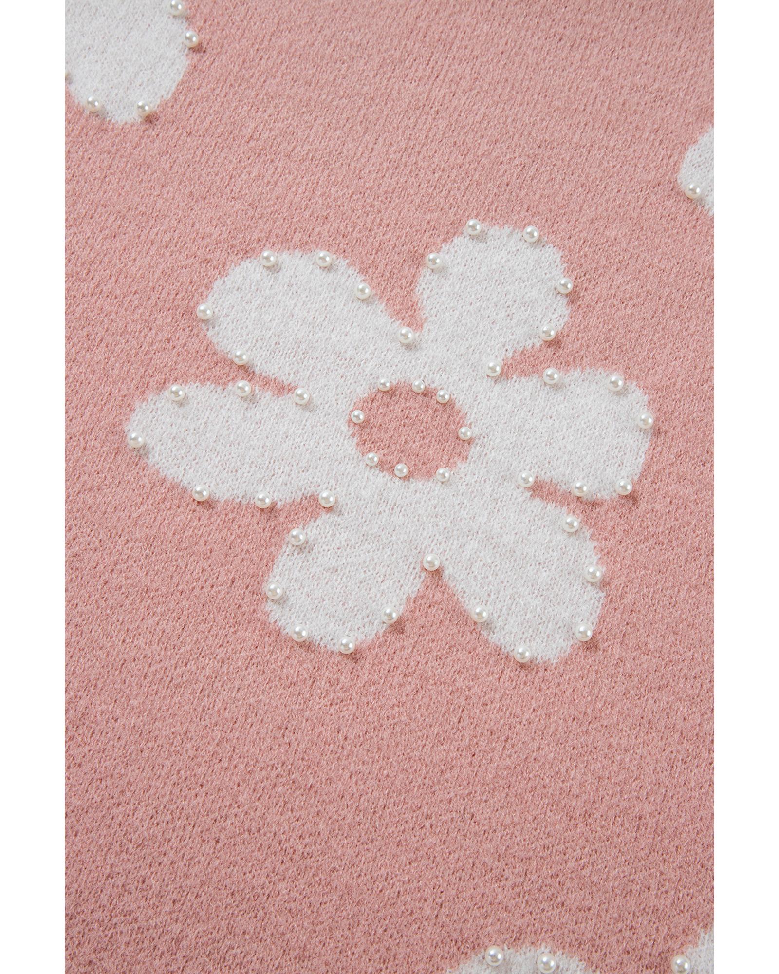 Light Pink Pearled Flower Distressed Edge Sweater T Shirt – S