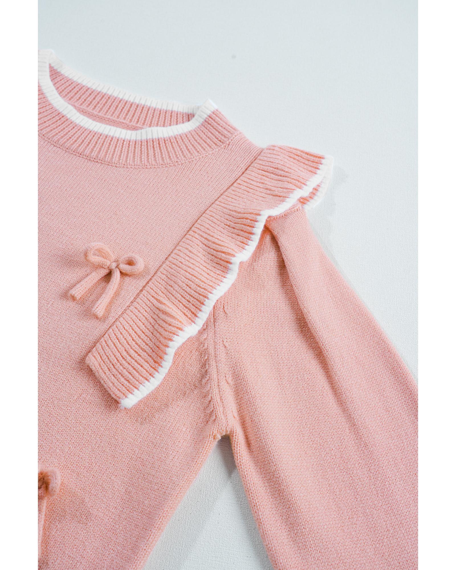 Light Pink Ruffled Bowknot Ribbed Trim Long Sleeve Sweater – L