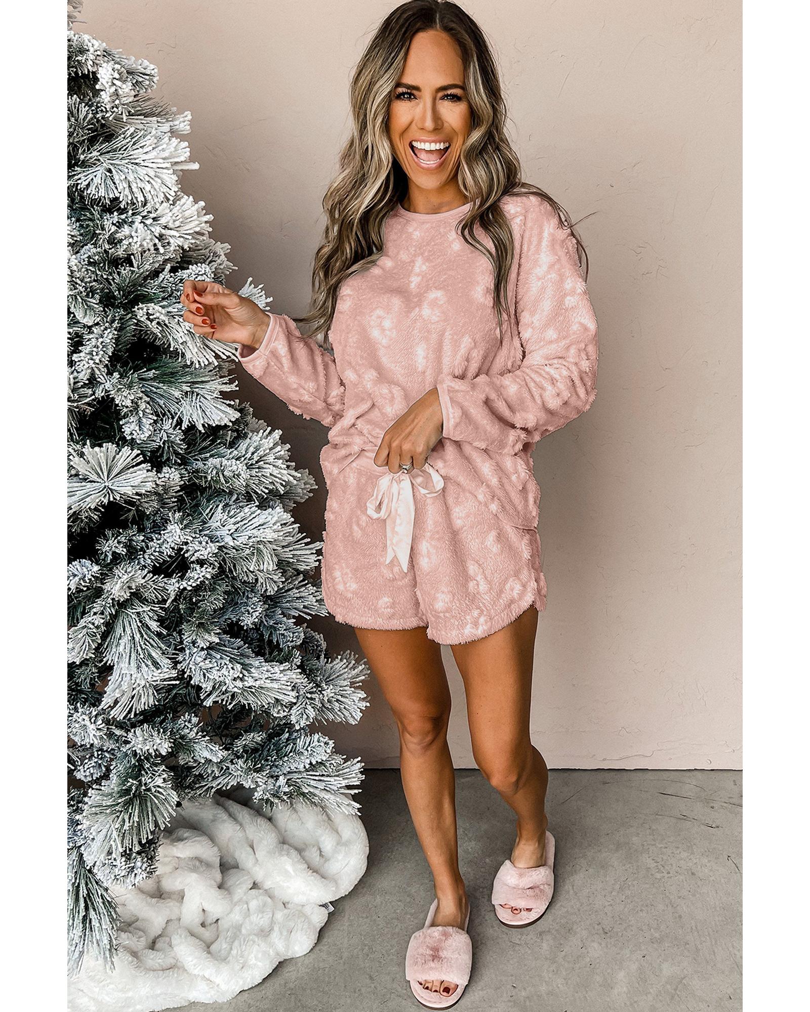 Light Pink Textured Leopard Fleece Loose Two Piece Lounge Set – L