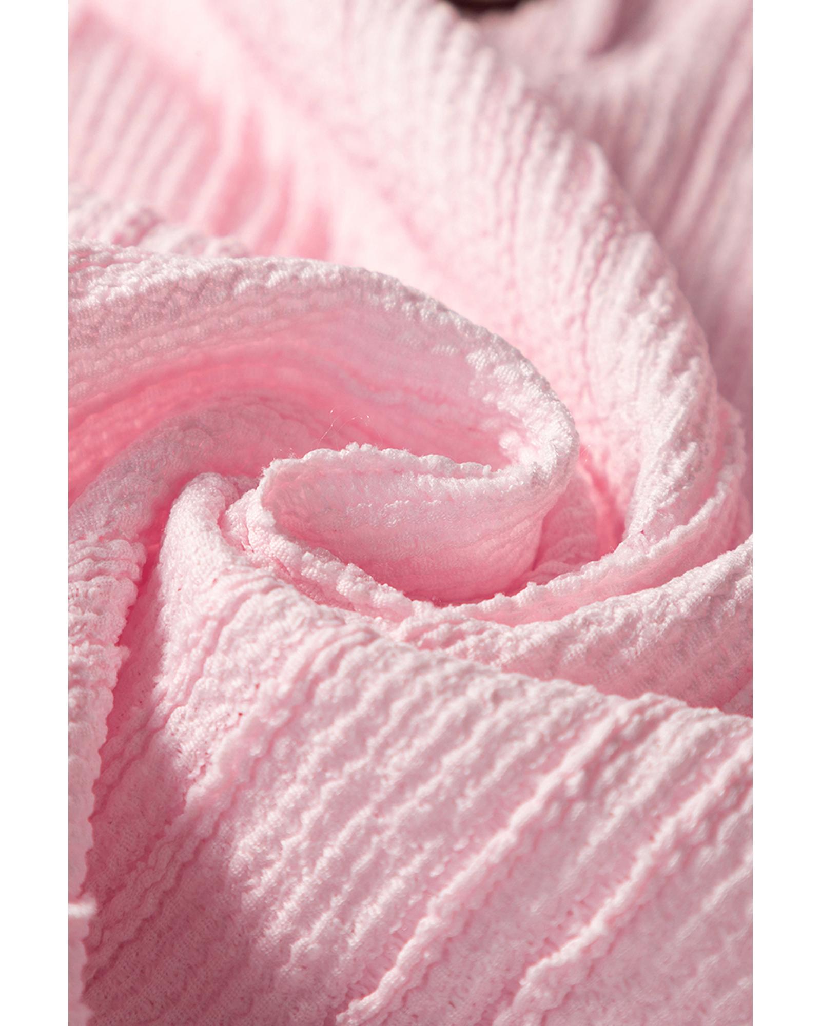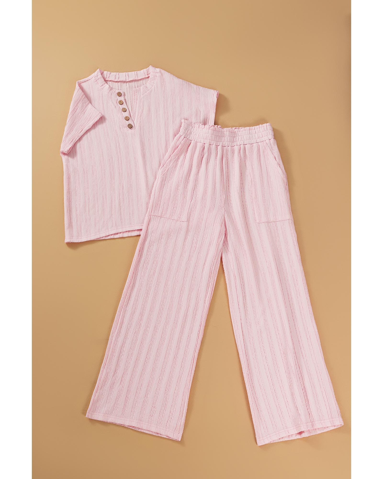 • Light Pink Textured Short Sleeve Henley Top and Pocketed Wide Leg Pants