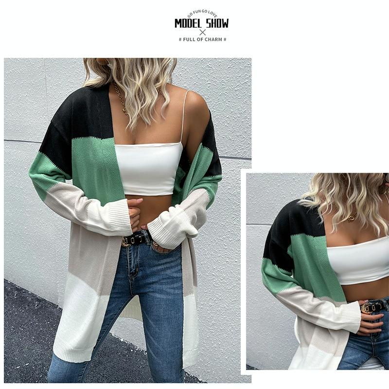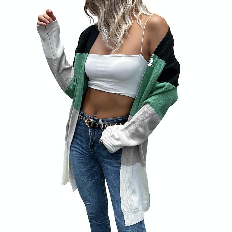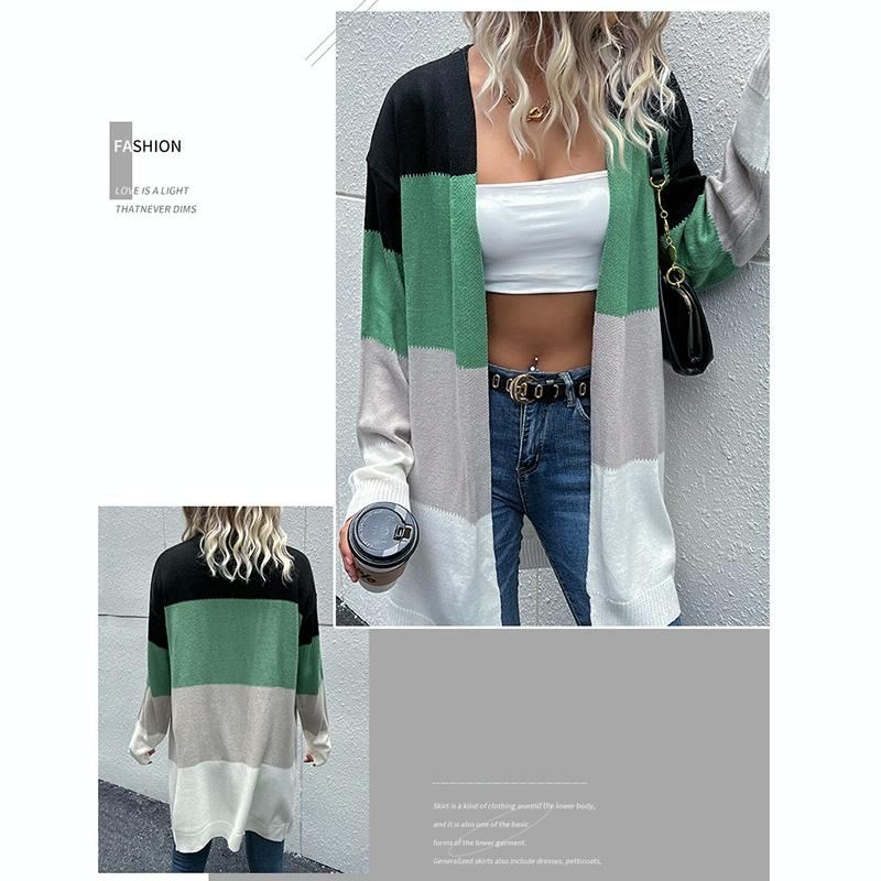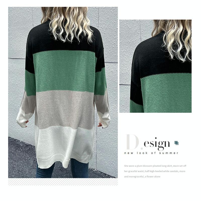 Long Cardigan Open Front Colour Block Cardigan Knit Sweaters Green – L