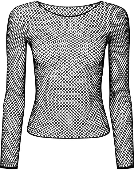 LONG SLEEVE FISHNET TOP Blouse T Shirt Tee Costume Party See Through – Black