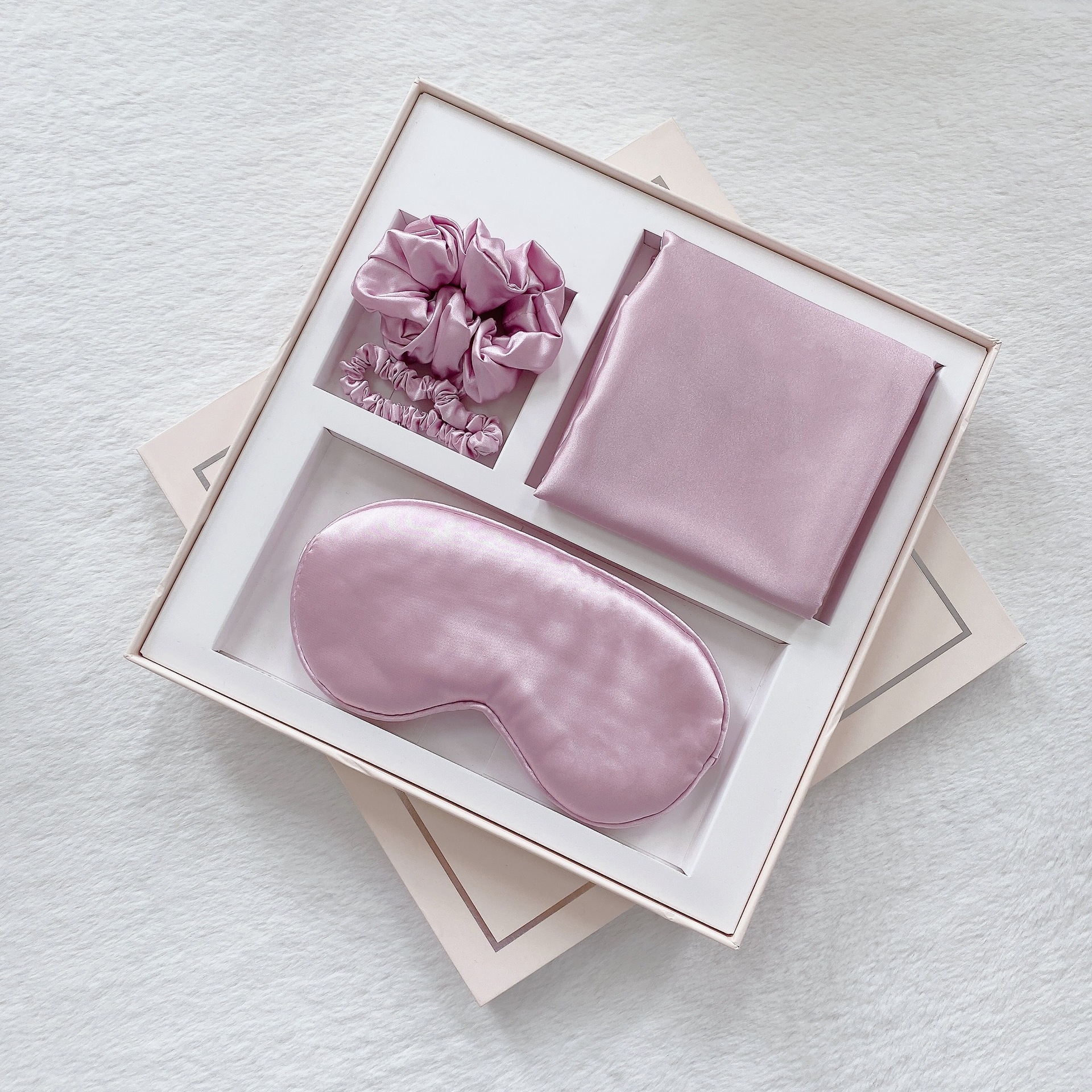 The pillowcase provides a soft and luxurious surface for your skin and hair, making it a perfect addition to your bedtime routine. The included hair accessories are gentle on your hair, helping to minimize damage while keeping your hairstyle in place. Packaged in an elegant gift box, this set makes a thoughtful gift for yourself or a loved one, ideal for travel, relaxation, or daily use.