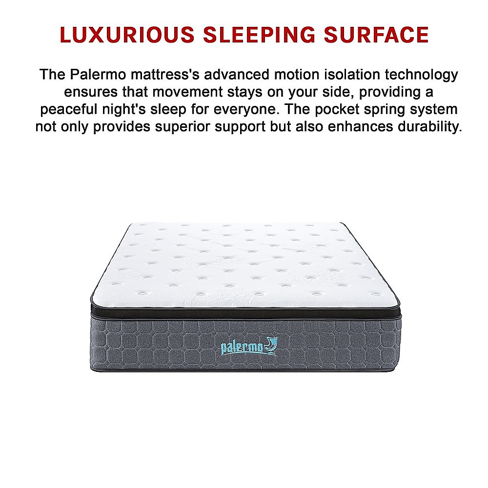 The Palermo mattress's advanced motion isolation technology ensures that movement stays on your side, providing a peaceful night's sleep for everyone.The pocket spring system not only provides superior support but also enhances durability. Reinforced side edges prevent sagging, ensuring your mattress holds its shape for years to come.