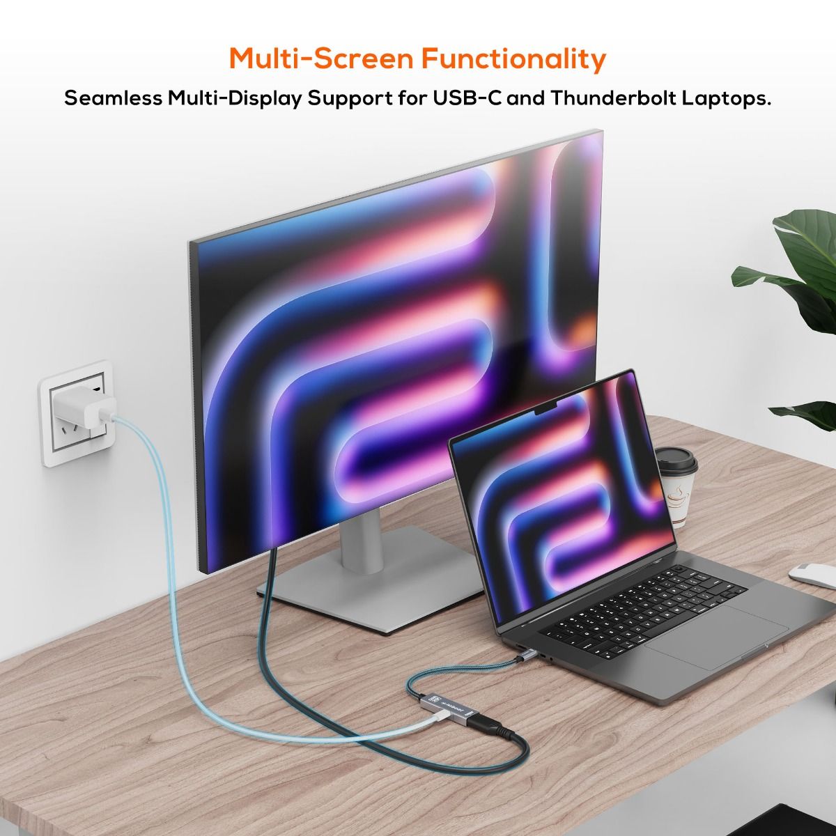 The adapter supports 100W Power Delivery pass-through charging, ensuring your laptop stays charged while you work, game, or stream. Enjoy uninterrupted display functionality and power delivery in one convenient connection.