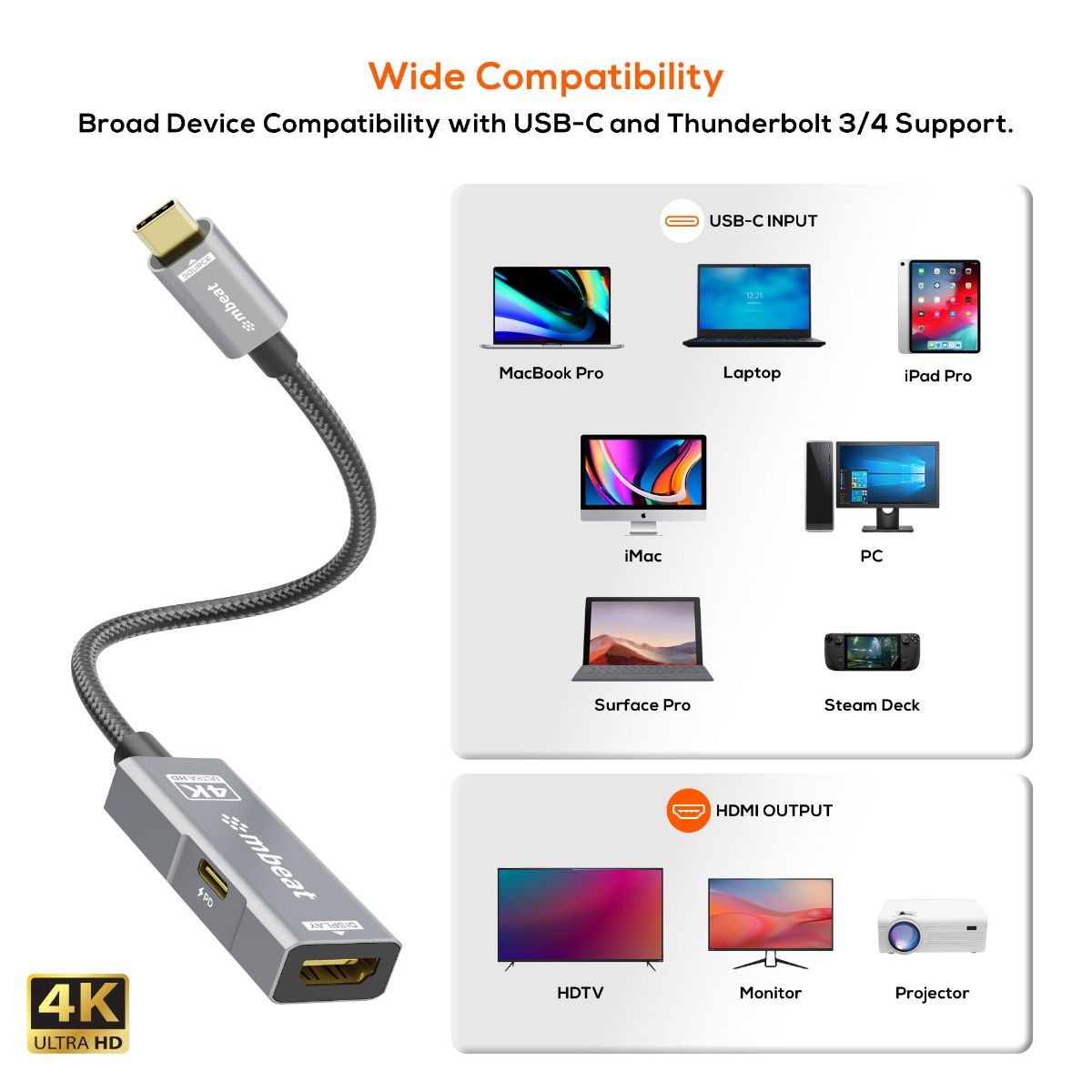 • Device Compatibility: compatible with MacBook Pro/Air, Surface Pro, Steam Deck, Galaxy S23, iPad Pro/Air, and other USB-C laptops, desktops, and monitors with HDMI inputs.