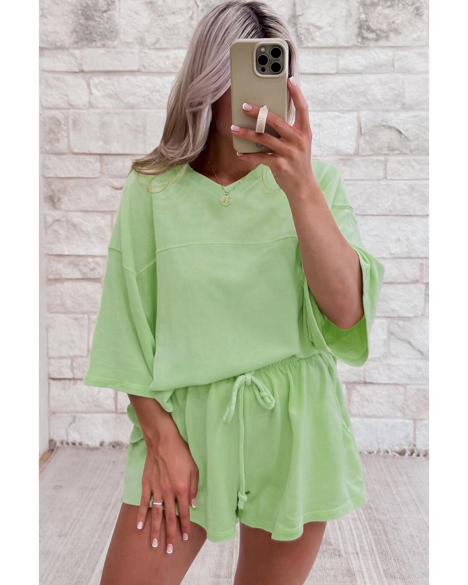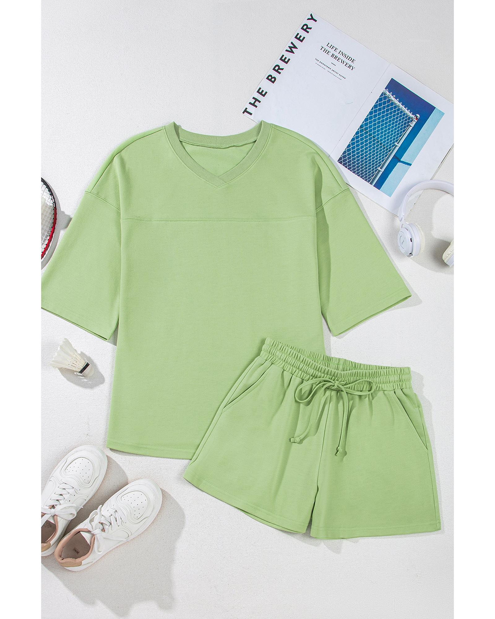 Meadow Mist Green Solid Loose V Neck Half Sleeve Tee and Shorts – M