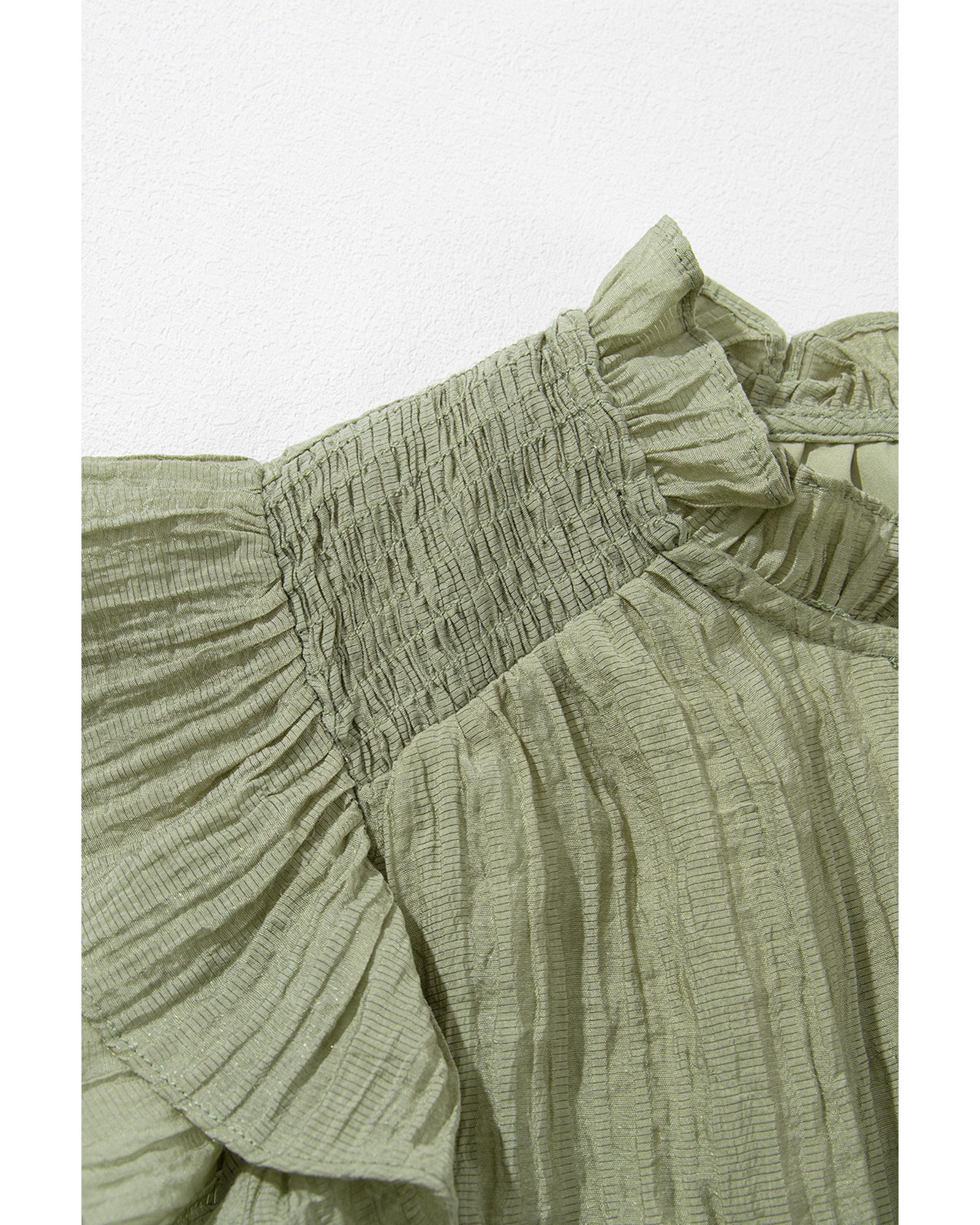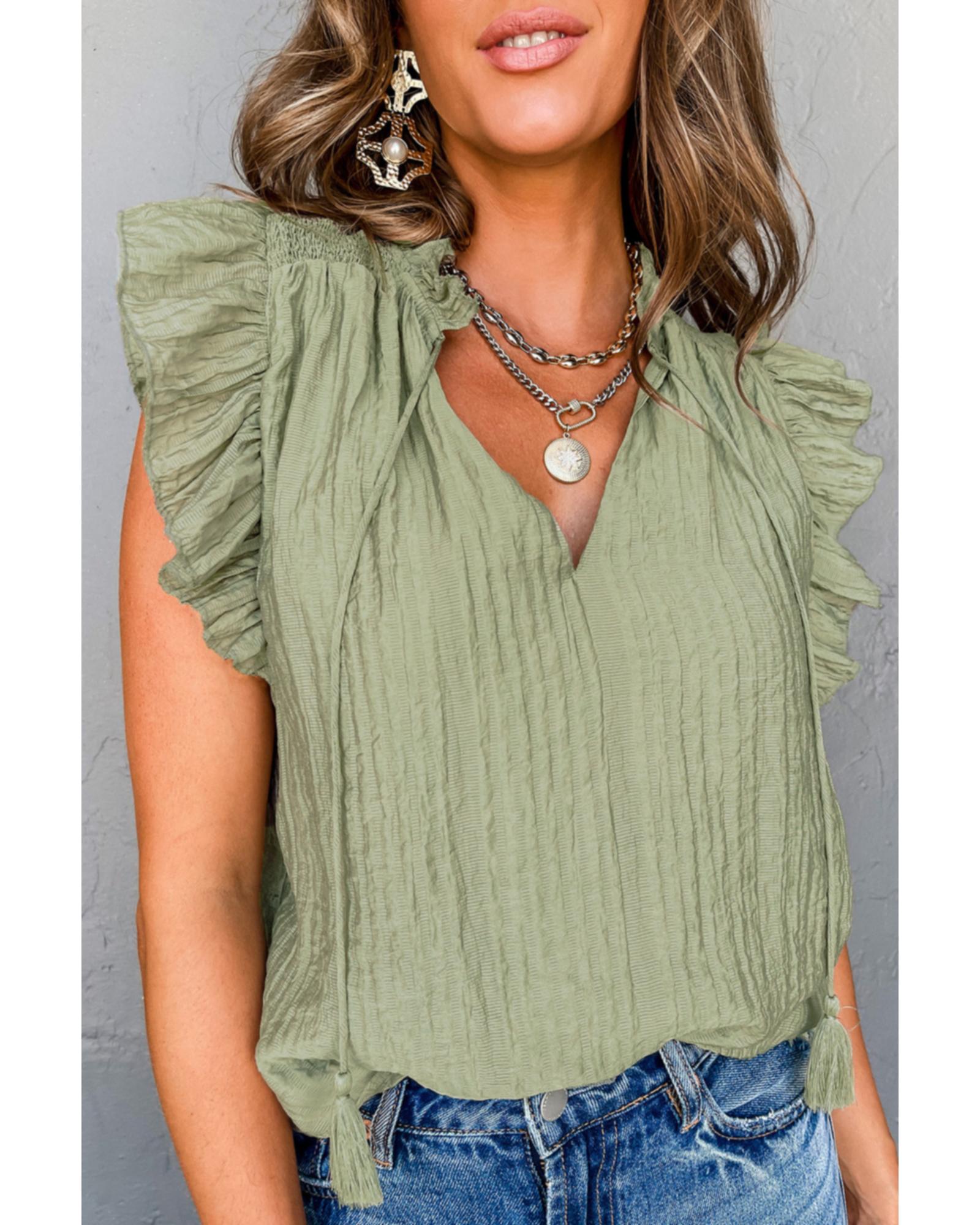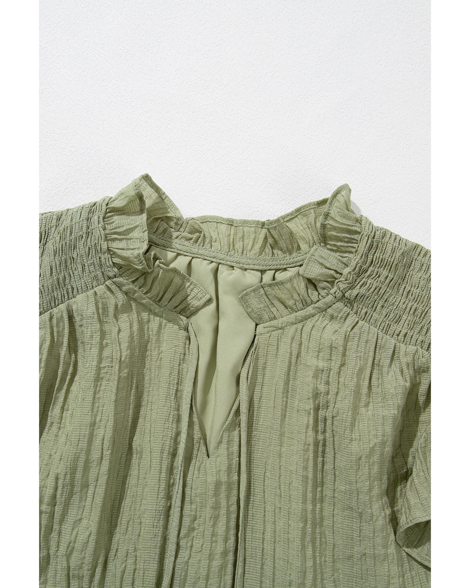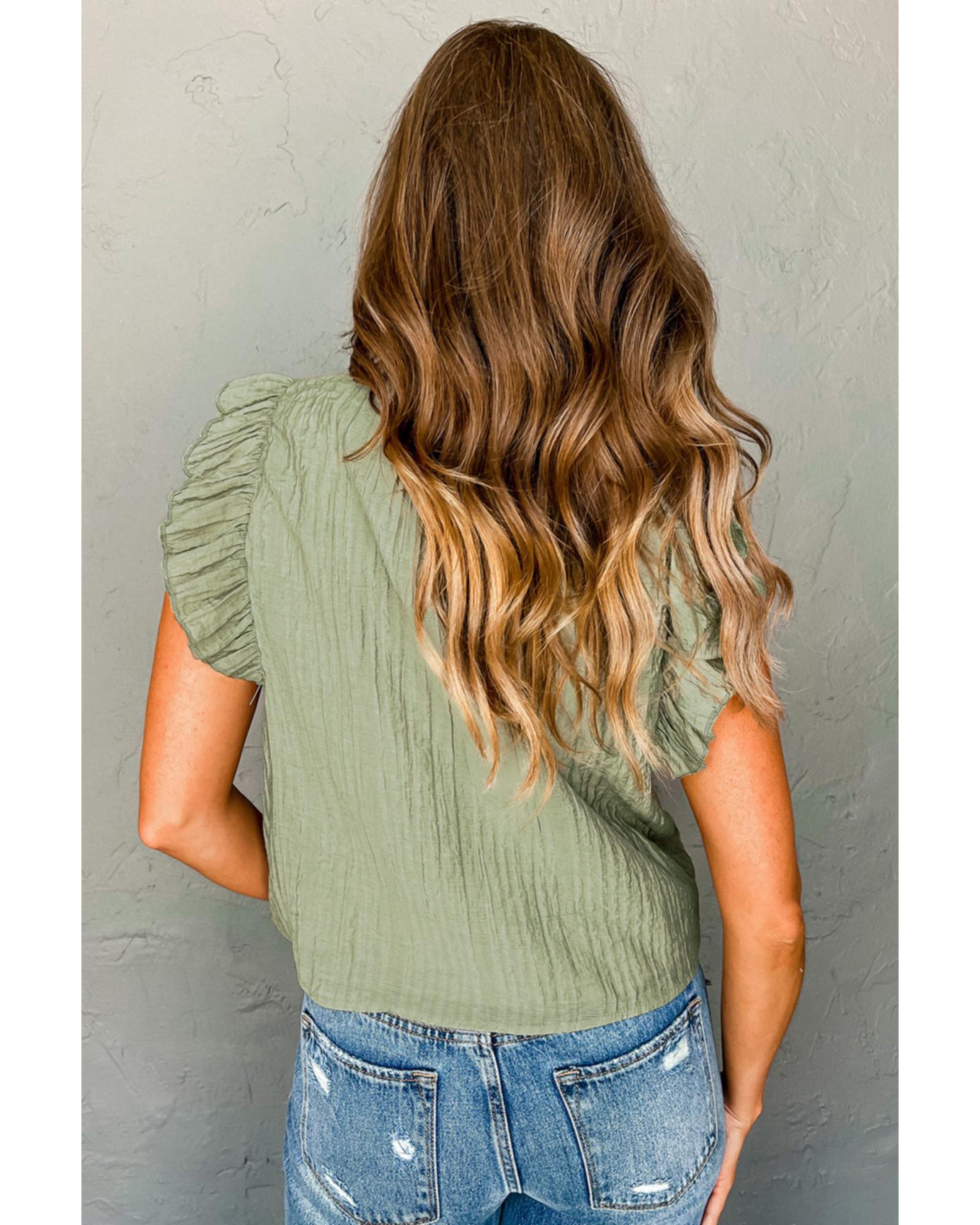 - Trendy and popular Meadow Mist Green V Neck Flutter Sleeve Textured Blouse