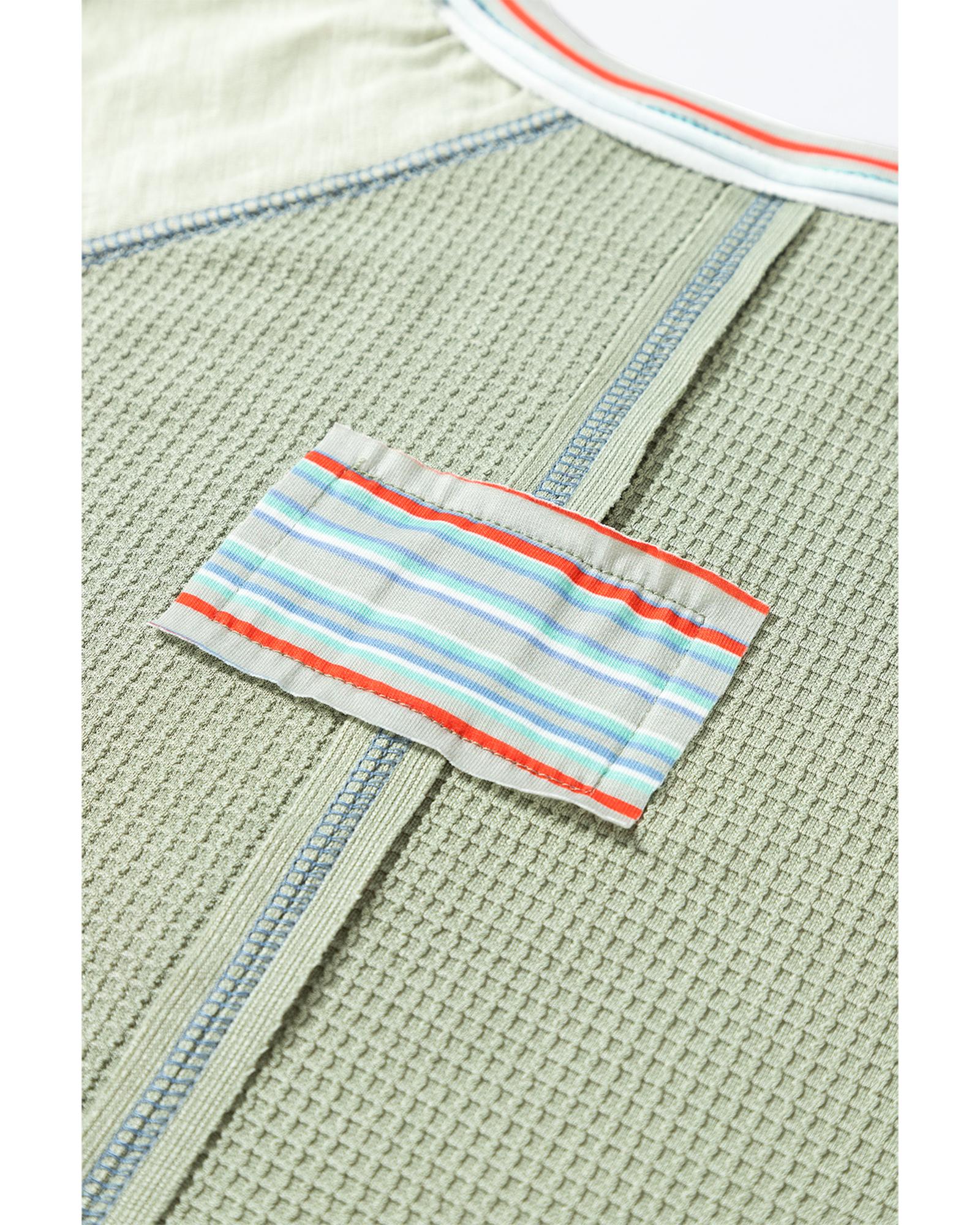 Meadow Mist Green Waffle Knit Wide Bracelet Sleeve Patchwork Raglan Top – L