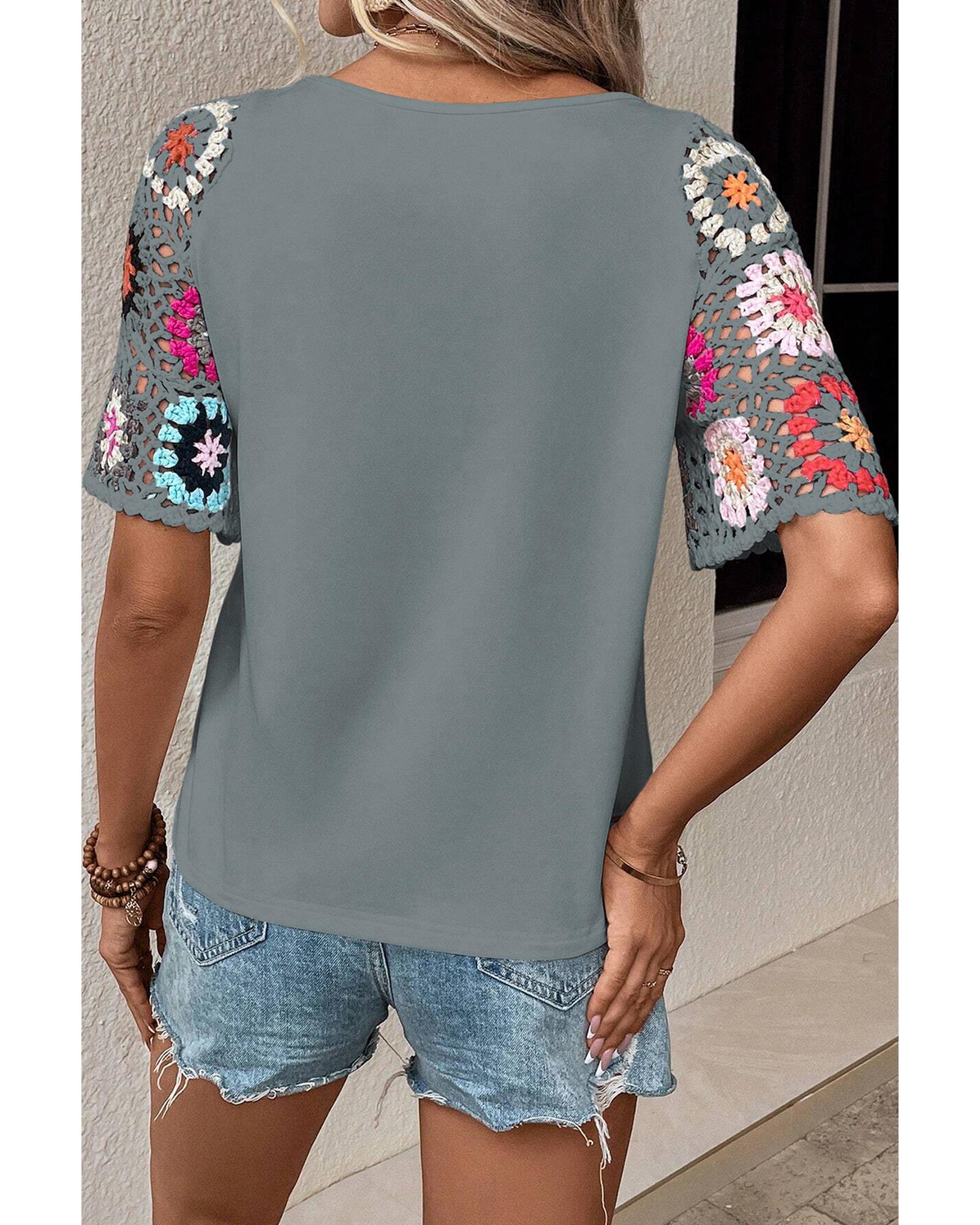 Medium Grey Floral Crochet Short Sleeve Top – M