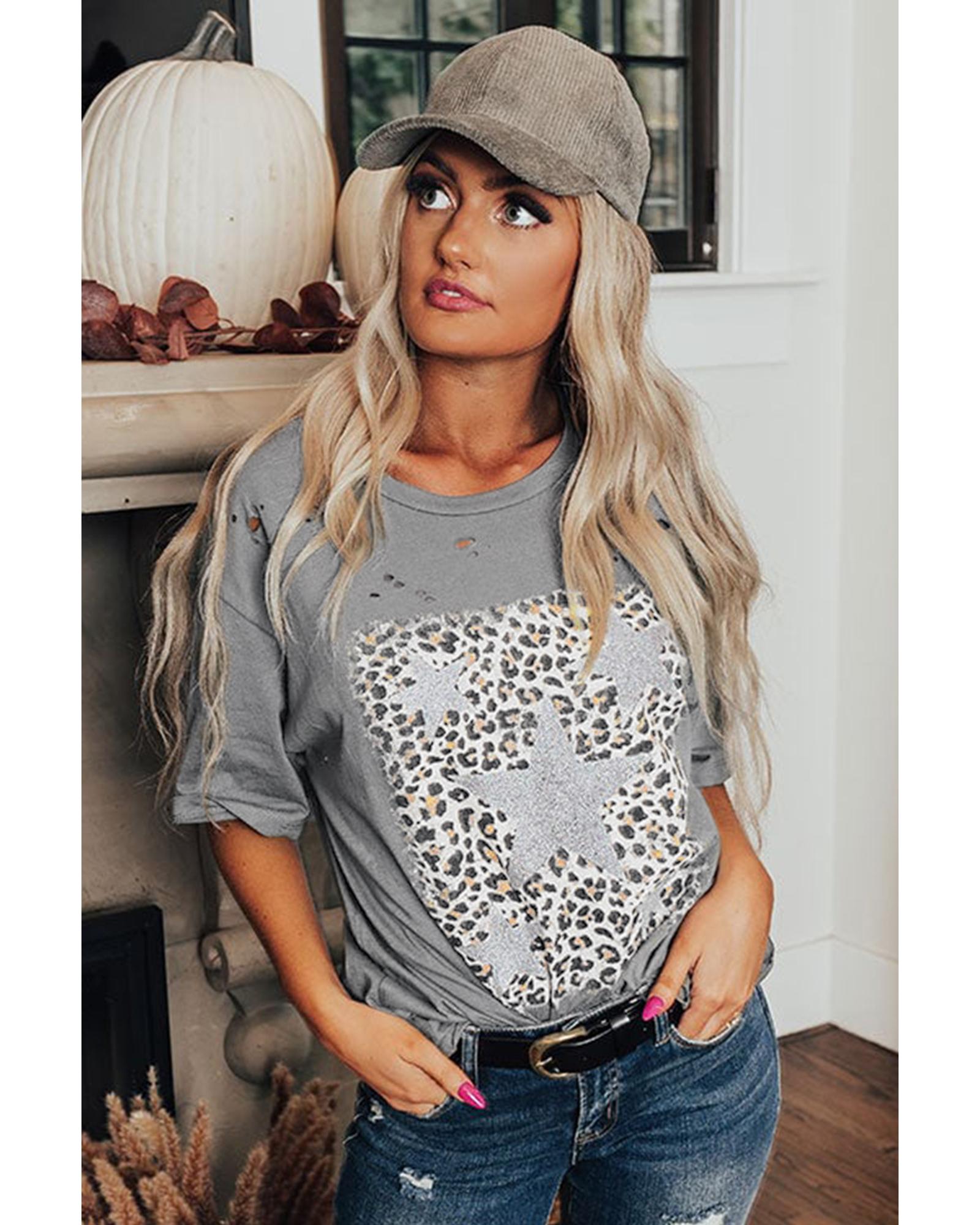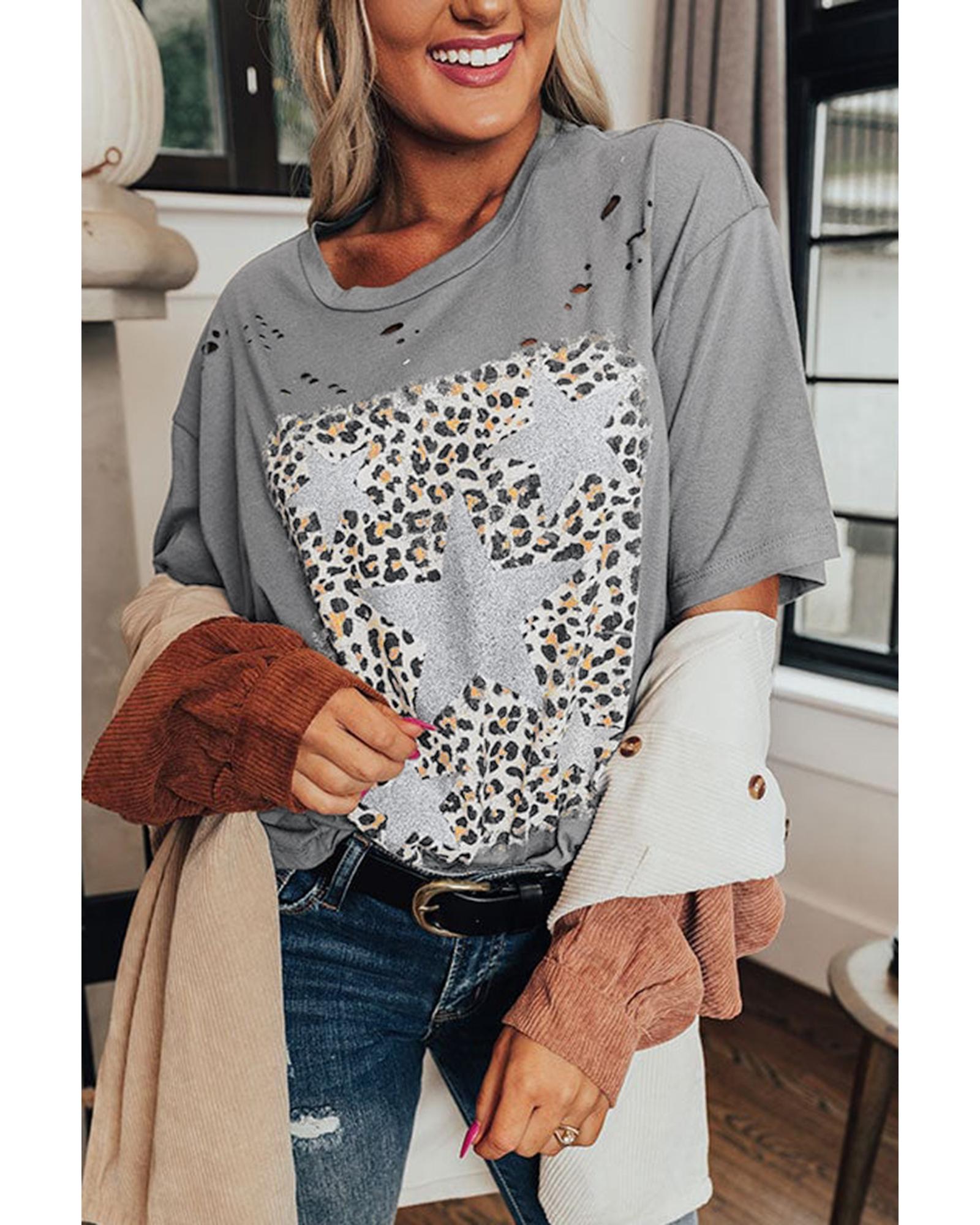 Medium Grey Stars Leopard Graphic Distressed Tee – XL