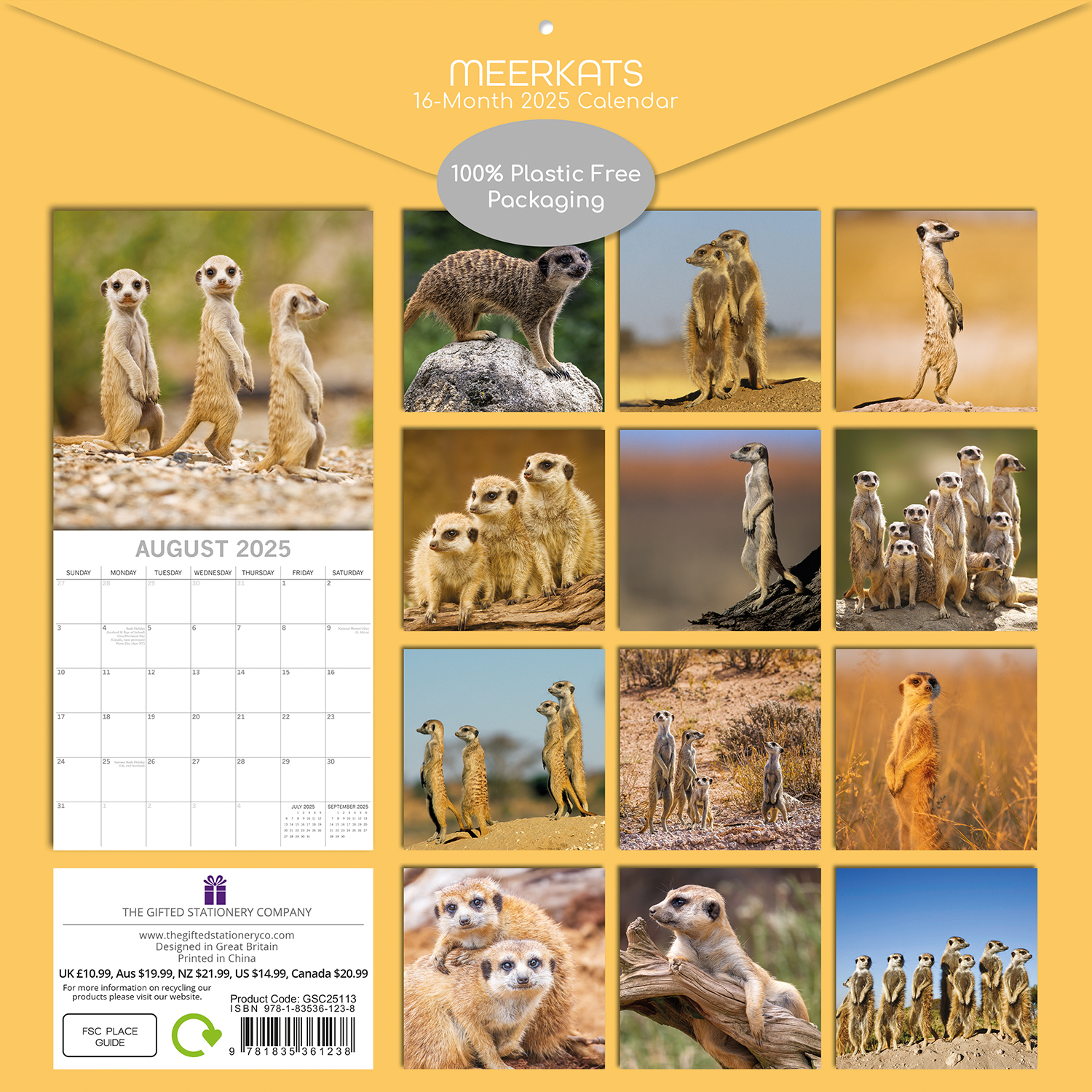 With their bubbly personalities and inquisitive nature, the meerkat will bring a smile to your face 365 days a year. Just try to resist that face! Have a play with these squirrel-sized cuties in 2025.This beautifully designed, brand-new calendar is both 100% plastic-free and fully recyclable. It comes shrink-wrapped in its original packaging and features: