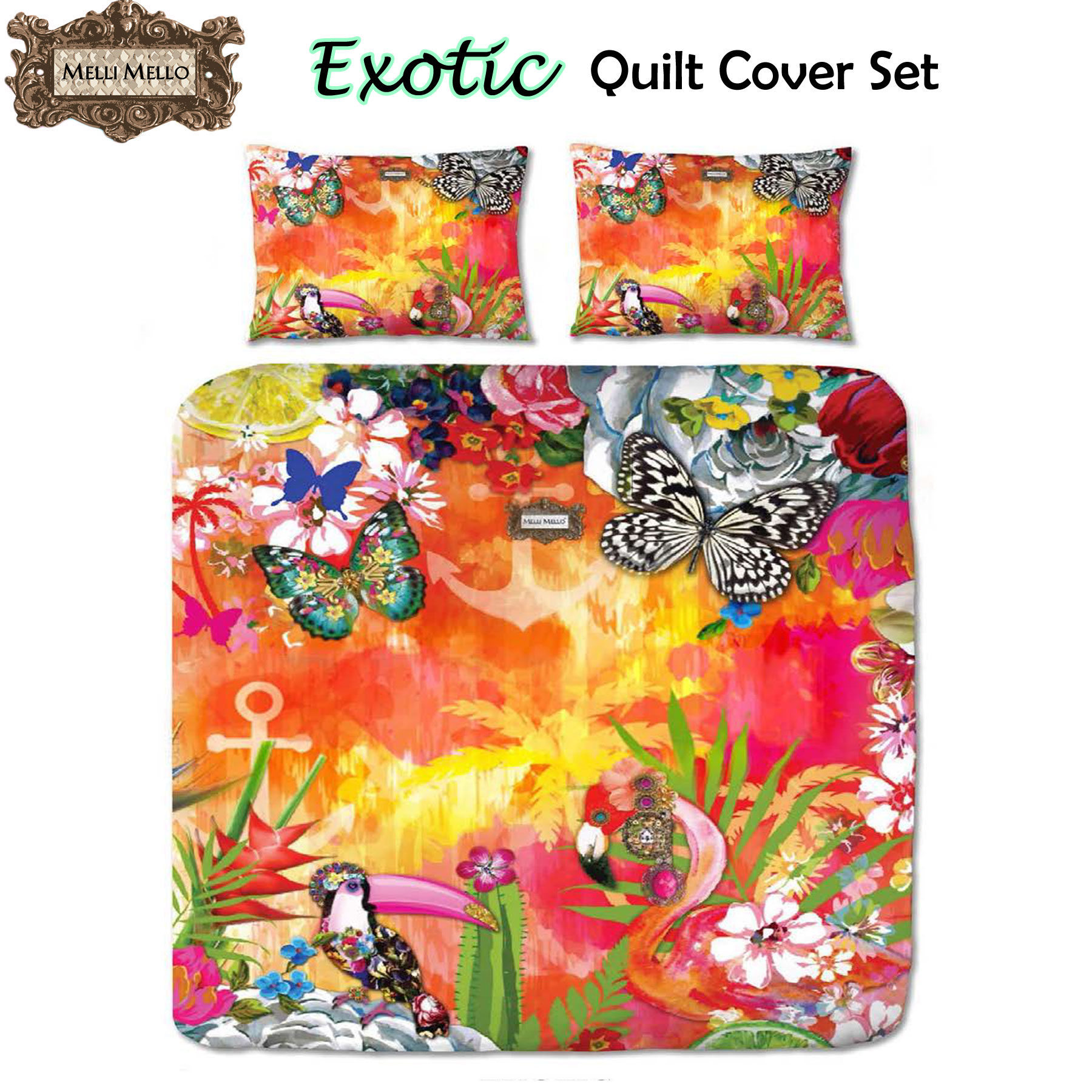 Make a strong statement to your bedroom with this Exotic Quilt Cover Set by Melli Mello which features a print design of exotic botanical garden accented with birds and butterflies in strong colours of white, black, red, green, yellow, orange, pink, hot pink, good, peral, blue, and purple that will brighten up your gloomy bedroom. Made from Pure Cotton/Satin Polyester.