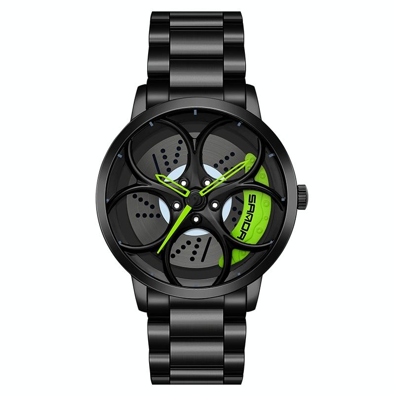 Men Steel Belt Quartz Watch with 3d Oval Hollow out Wheel – Black Green