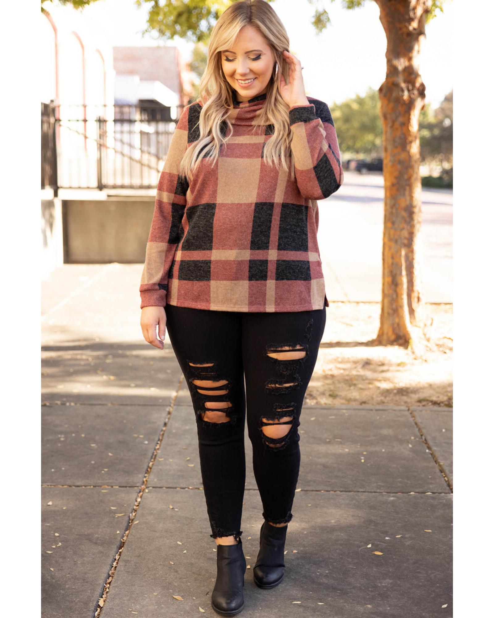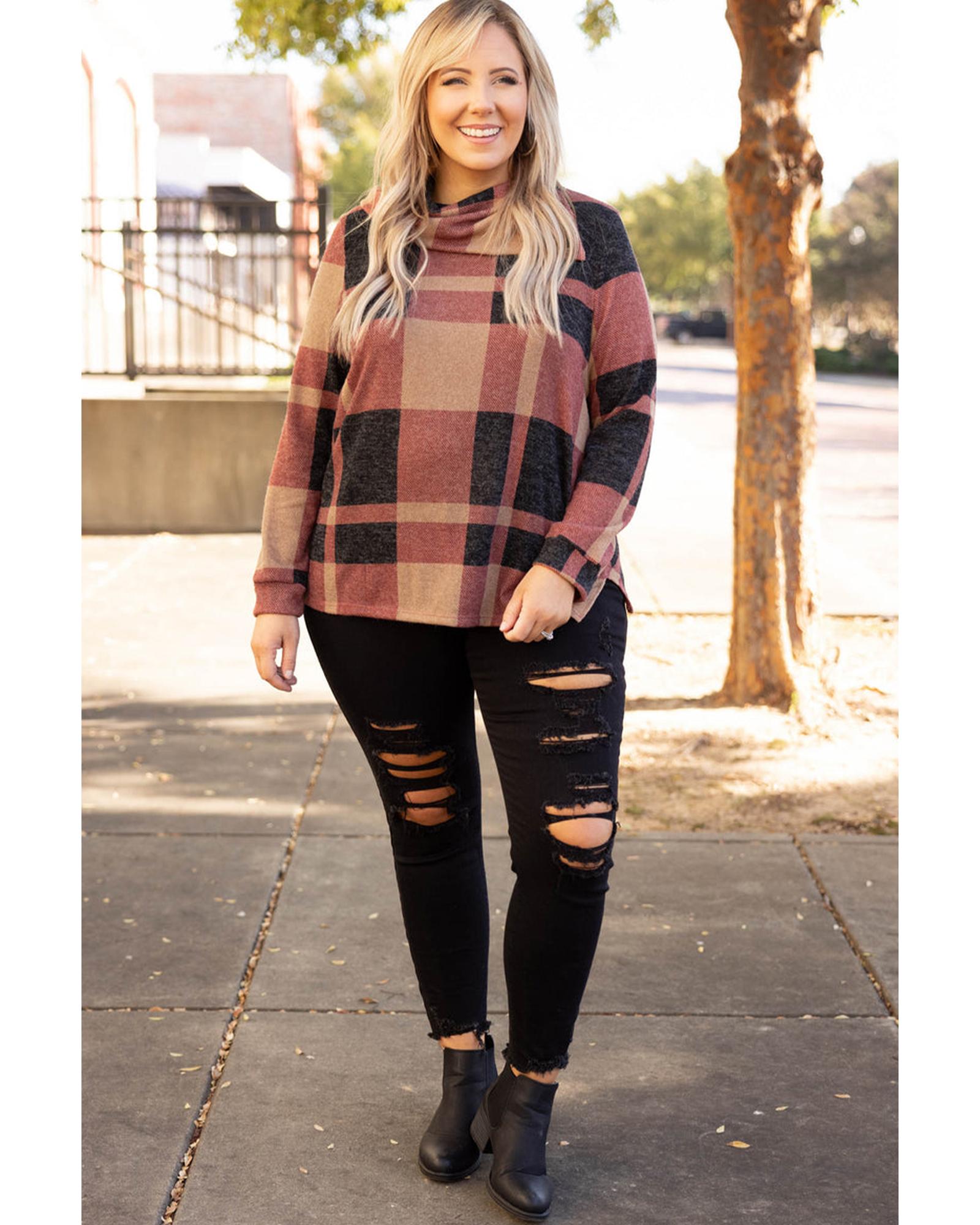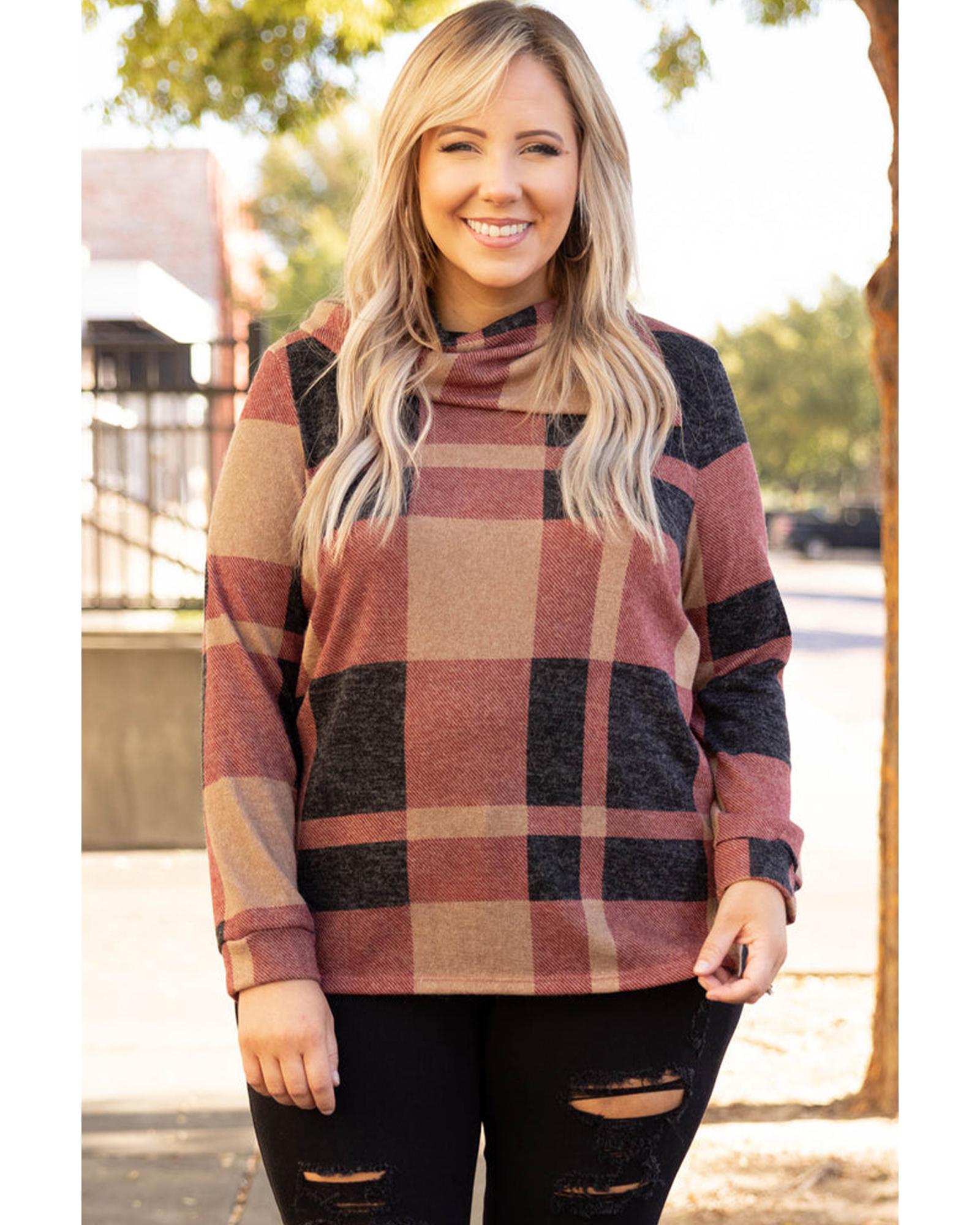Mineral Red Plus Size Plaid Print Button Decor Asymmetric Neck Top – 3X