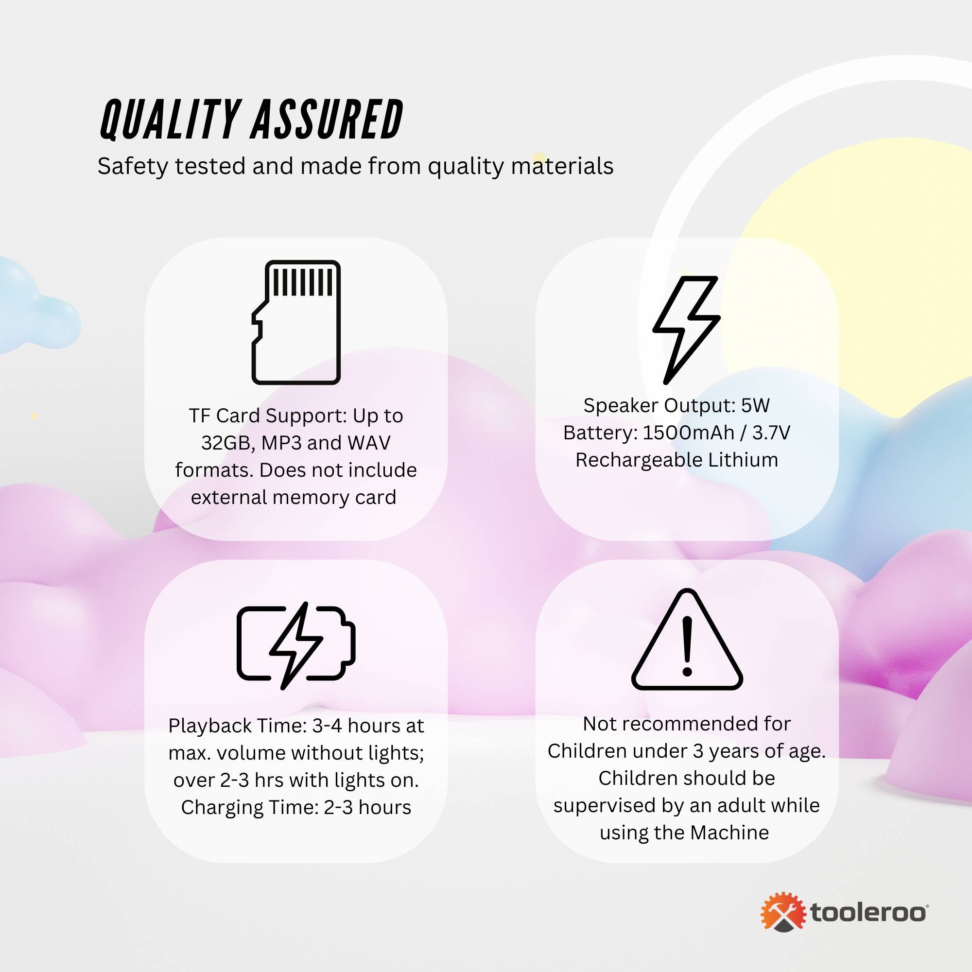 - TF Card Support: Up to 32GB, MP3 and WAV formats