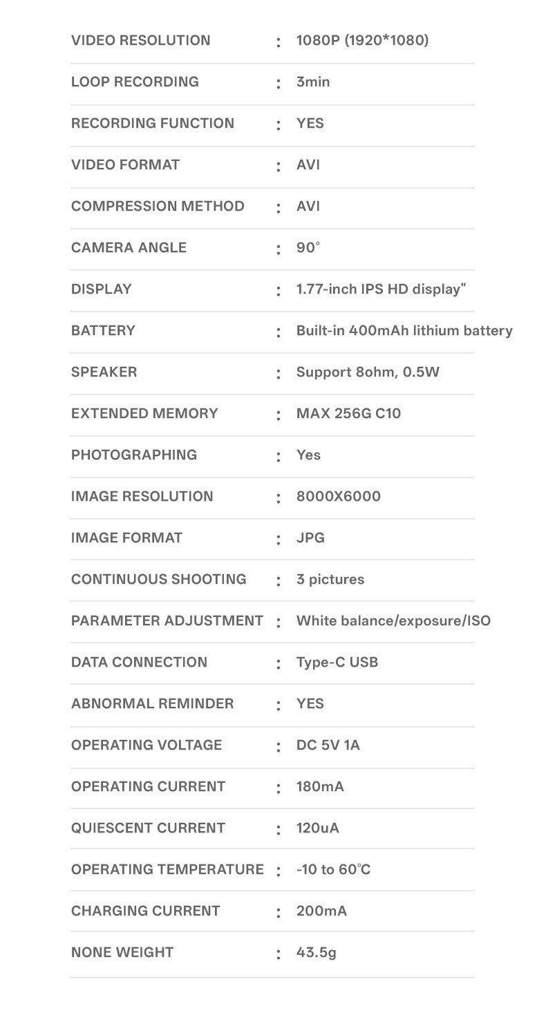 • Long Endurance Battery: The built-in 400mAh lithium battery supports up to 80 minutes of continuous recording on a full charge.