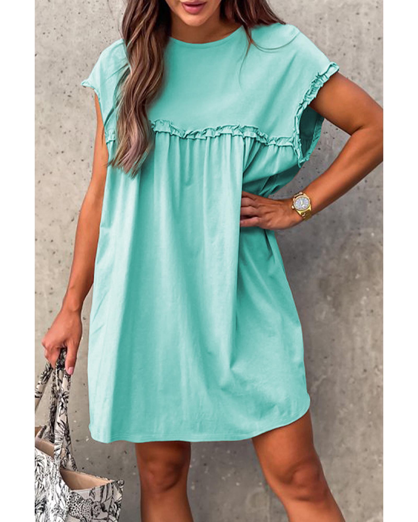 - Mint Green Frilled Trim Crew Neck Loose Fit Mini Dress