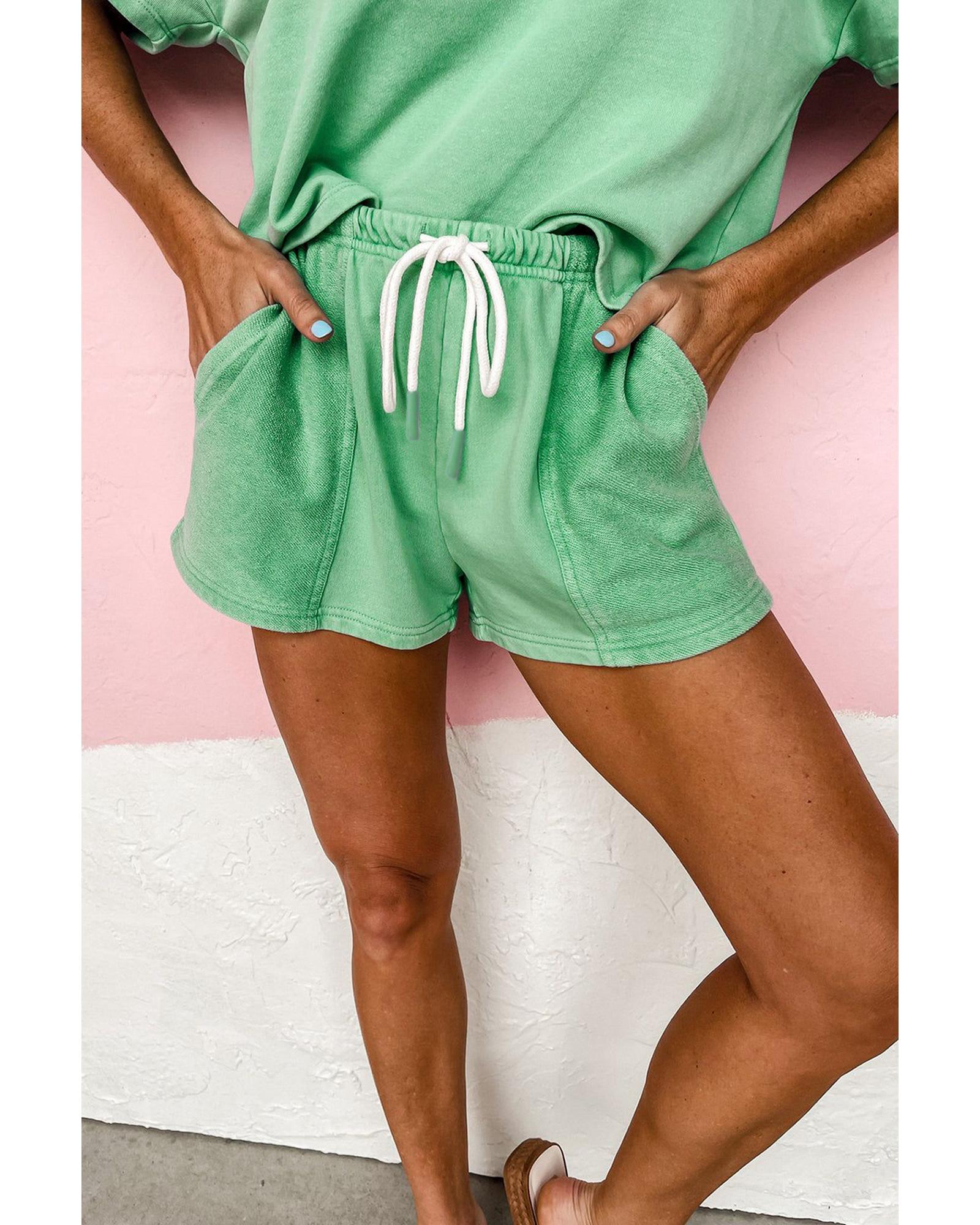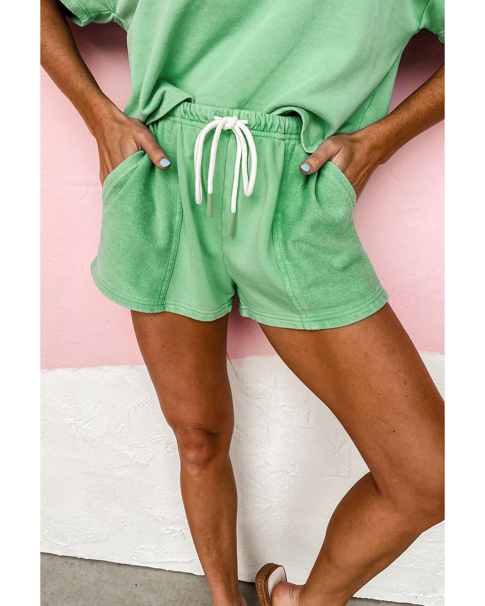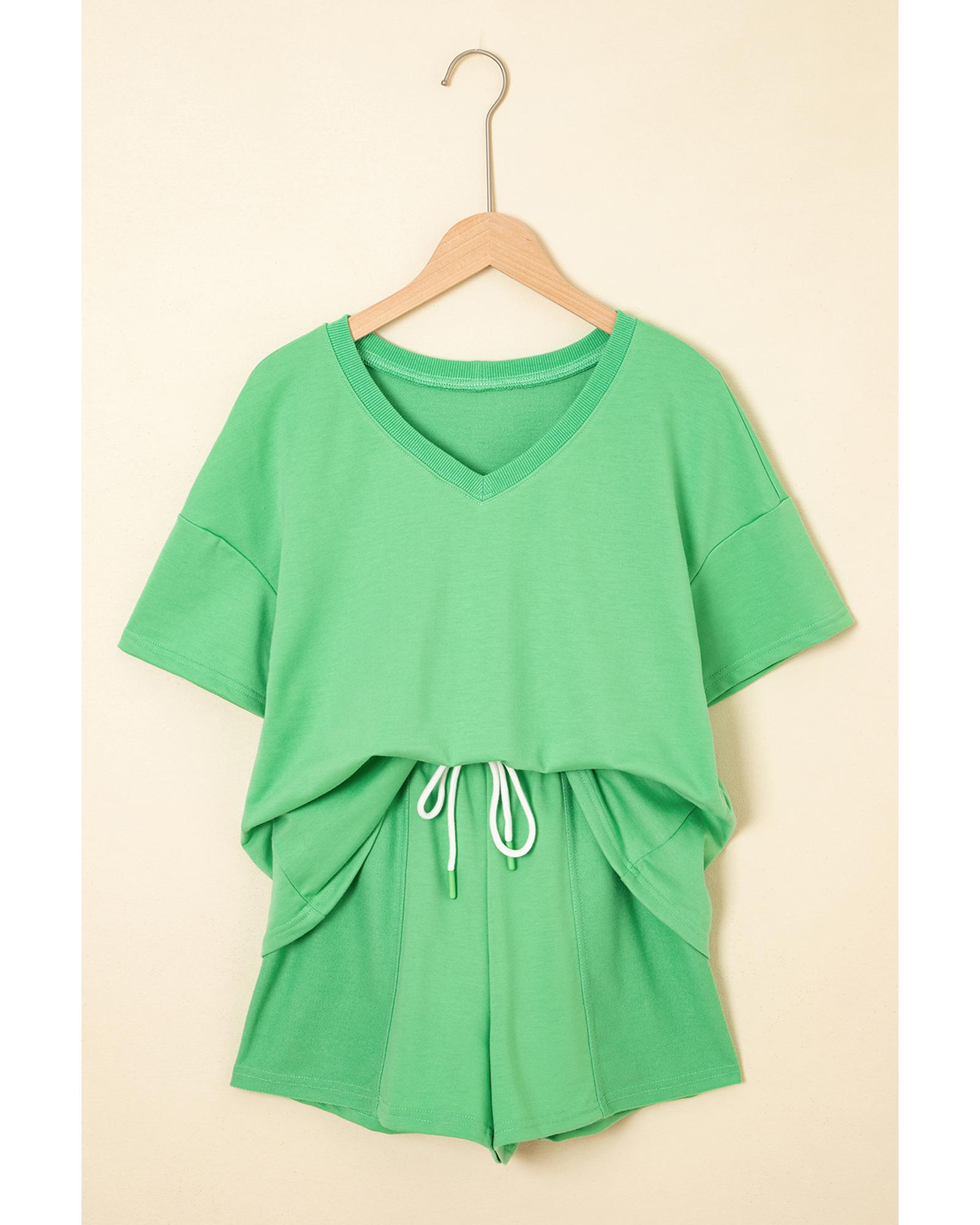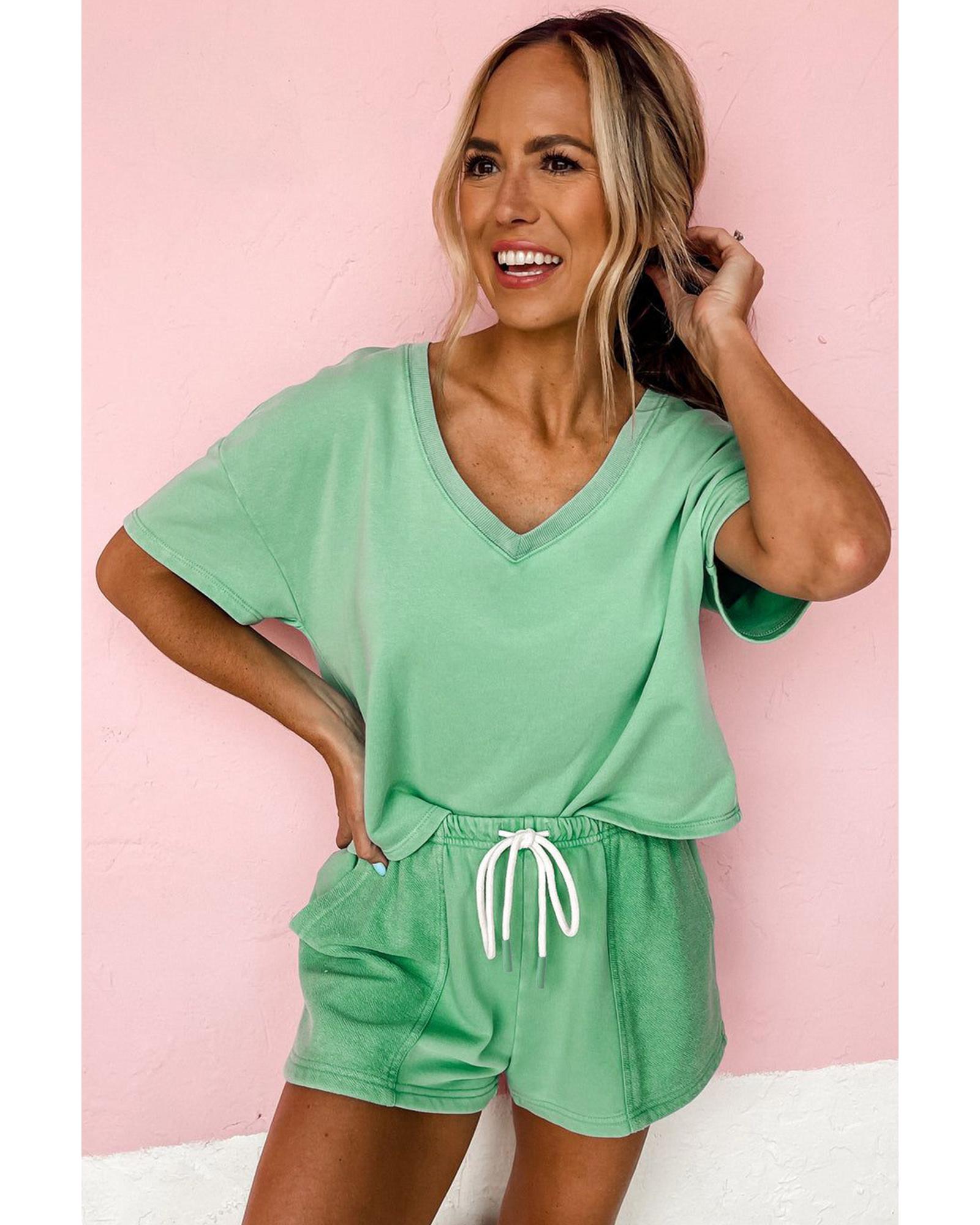 Mint Green V Neck Drop Shoulder Tee and Patchwork Drawstring Shorts Set - XL Original price was: $64.99.Current price is: $34.99.