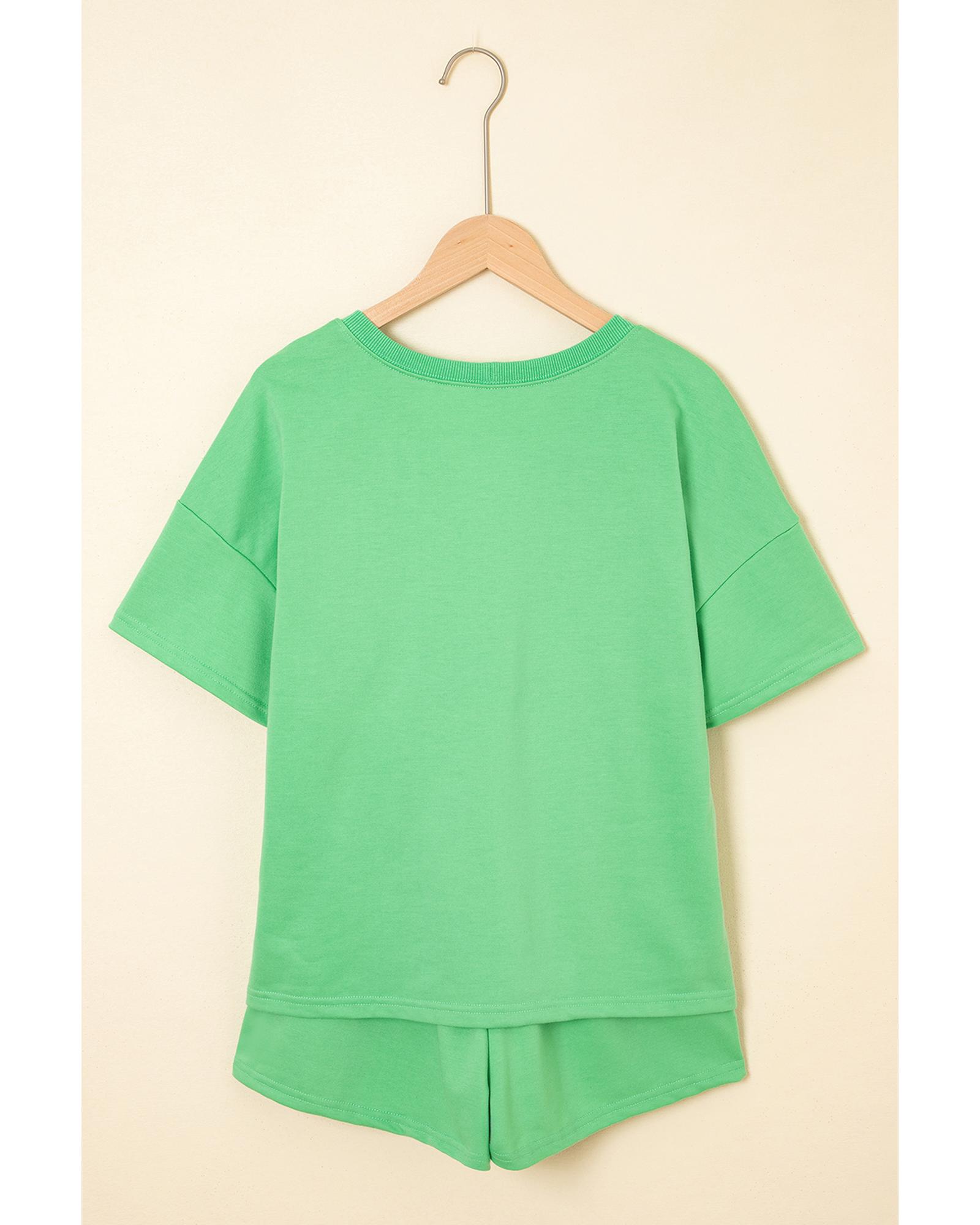 Mint Green V Neck Drop Shoulder Tee and Patchwork Drawstring Shorts Set – S