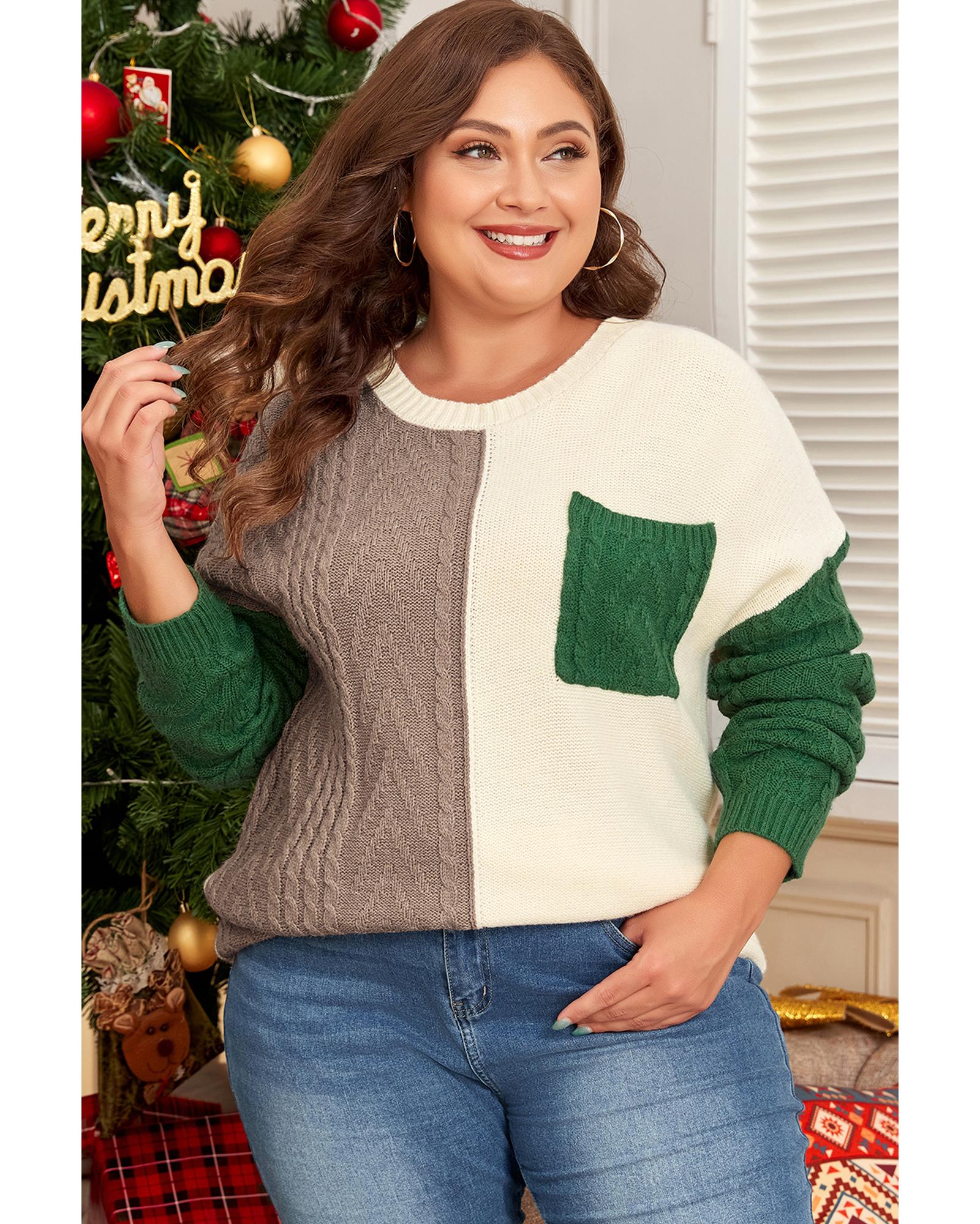 Mist Green Plus Size Cable Knit Color Block Drop Shoulder Sweater – 1X