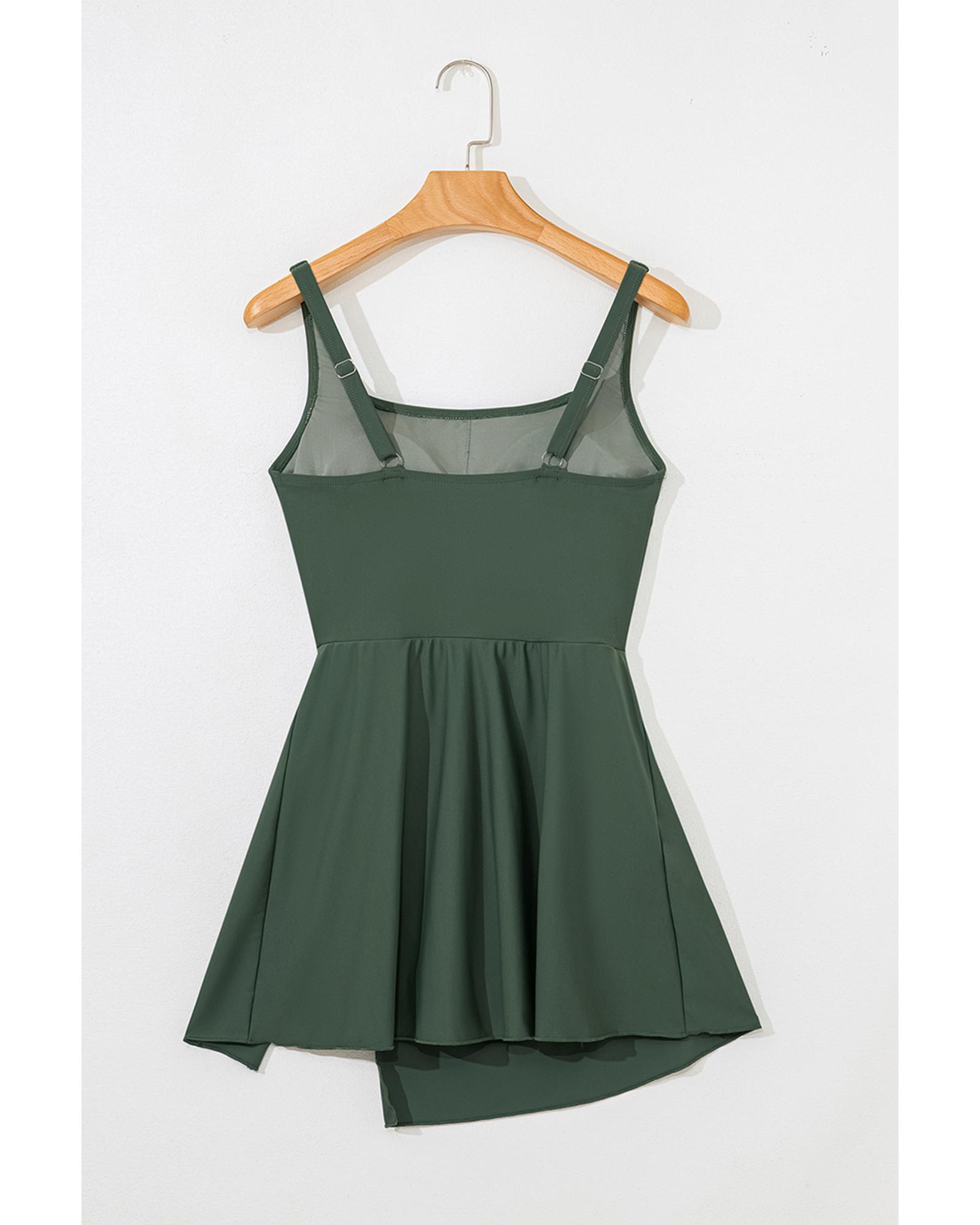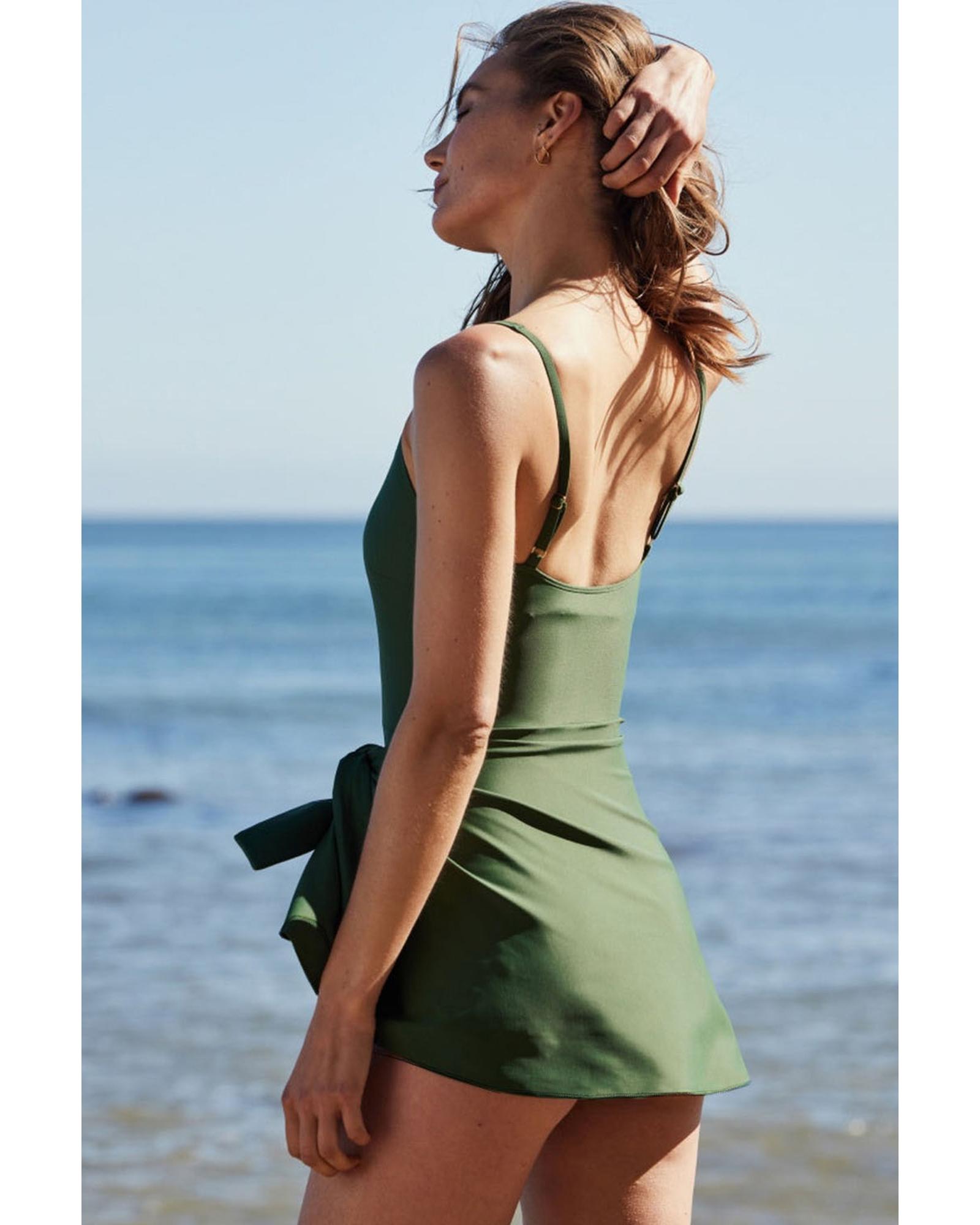 Mist Green Side Tied Waist Square Neck Adjustable Straps A-line One Piece Swim Dress – S