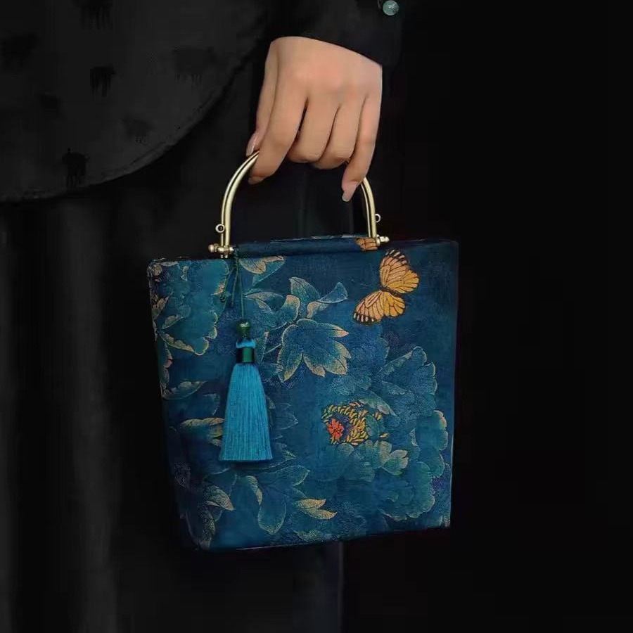 Adorned with intricate embroidery, this bag showcases classic Chinese motifs. The structured bucket shape offers a spacious interior for all your essentials, while the delicate tassel adds a touch of graceful movement. Versatile enough to complement a cheongsam, Hanfu, or even your everyday attire, this bucket bag is a must-have for those who appreciate beauty and craftsmanship. The metal handles add to the elegant vibe.