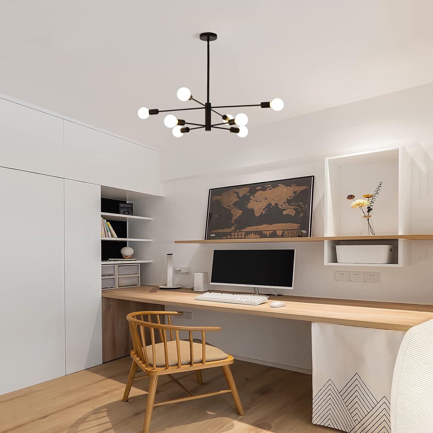 - This sputnik chandelier lighting is perfect for any ceiling, flat or sloped, with its universal head. Installation is easy and quick with pre-wired and pre-threaded arms, and all mounting hardware and installation guide are included in the package. Simply install your chosen E27 bulbs into the connectors and mount the plate on the ceiling.