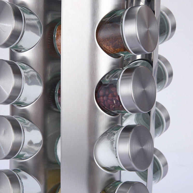 Modern stainless steel rounded corner rotating spice rack with 16 empty glass jars (88 ml each)