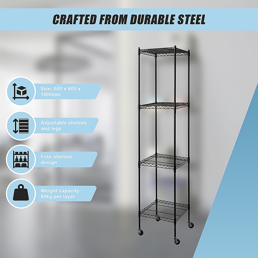 Not only is this four-shelf unit robust, but it also provides mobility. Its lightweight and compact design allow you to effortlessly move it around to suit your ever-changing needs.