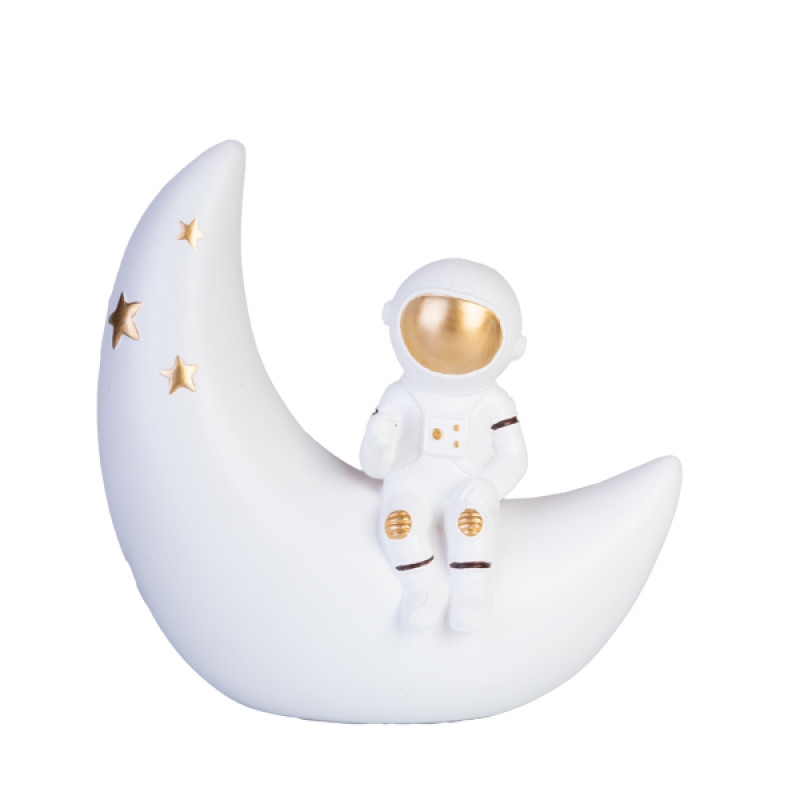 Features astronaut sitting on a crescent mood decorated with metallic stars
