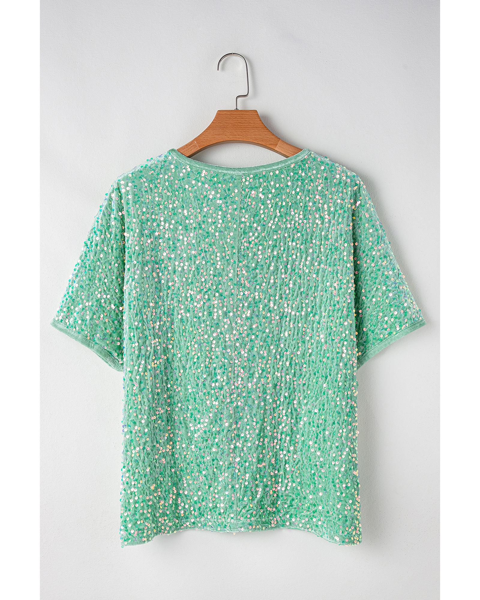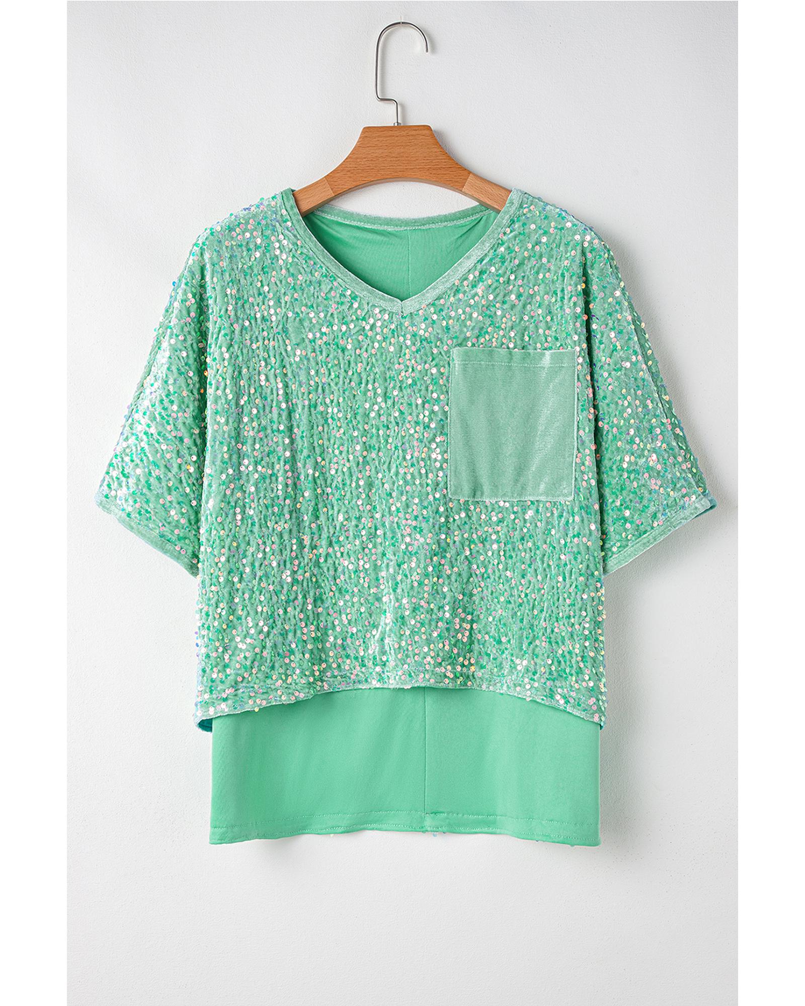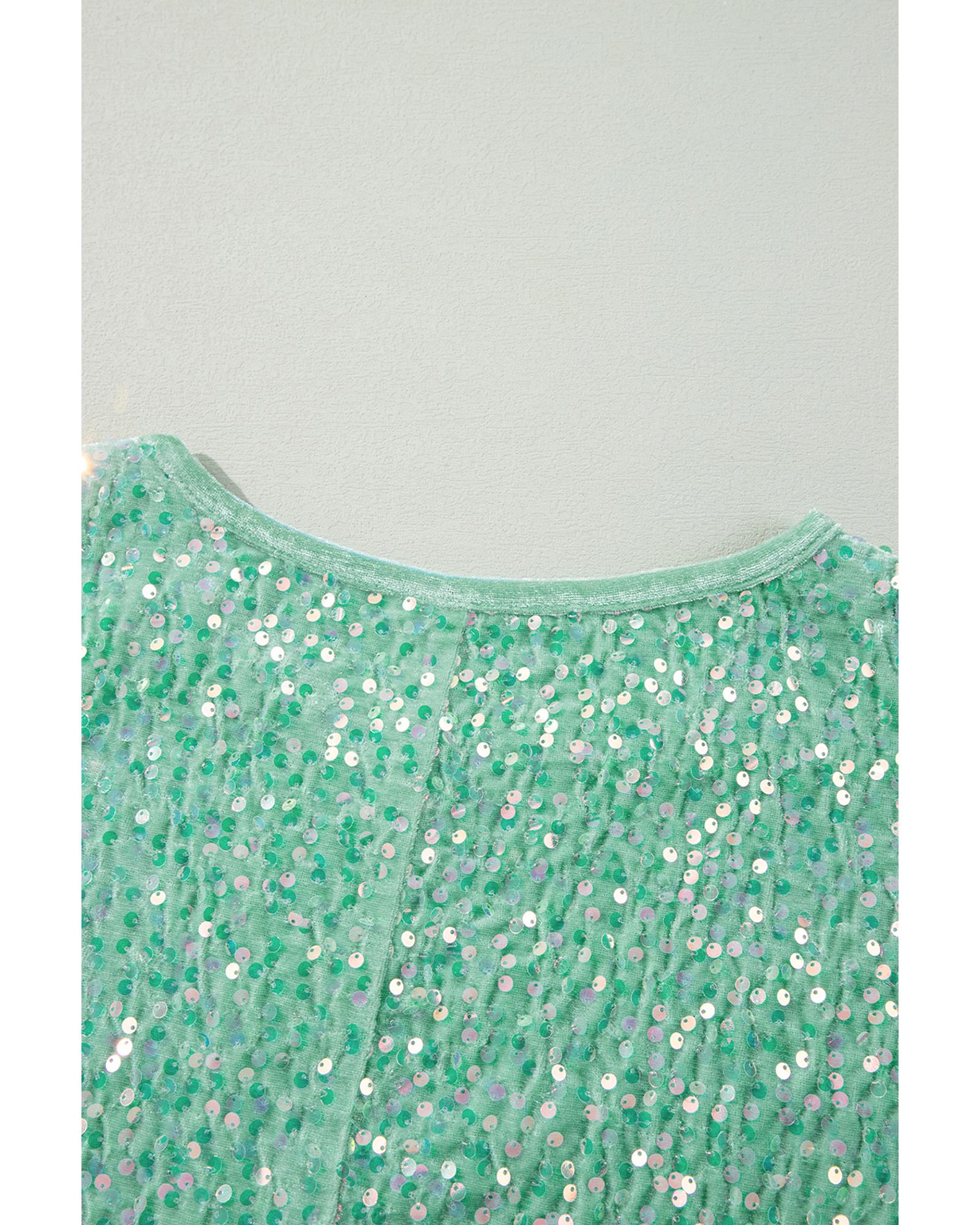 Moonlight Jade Sequin Batwing Sleeve V Neck Velvet Blouse – M