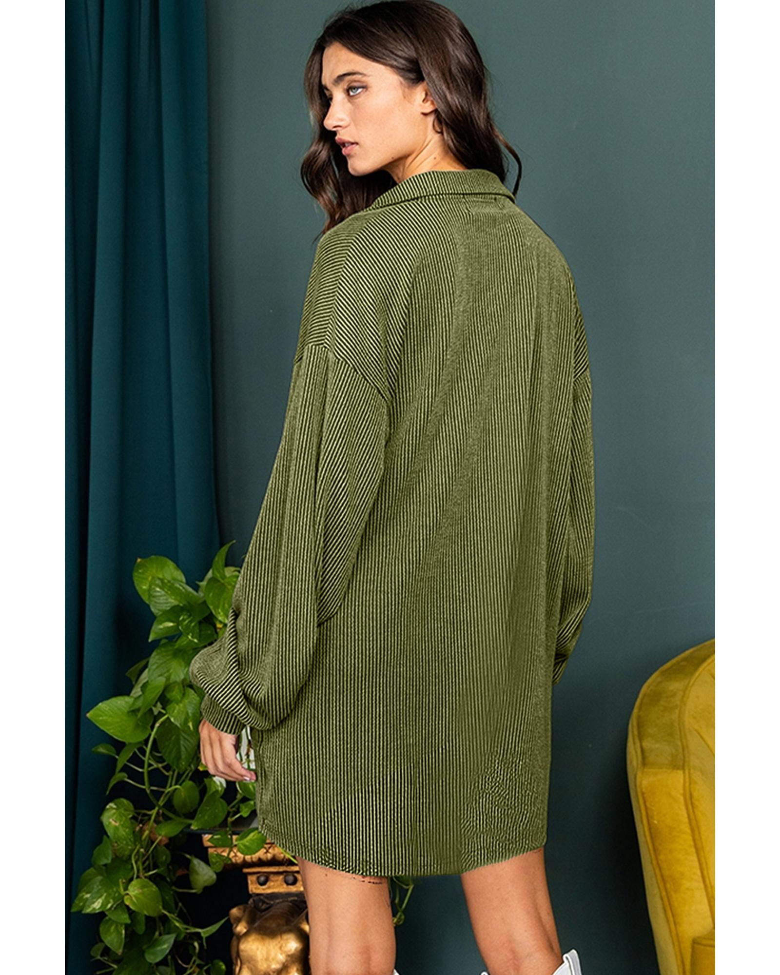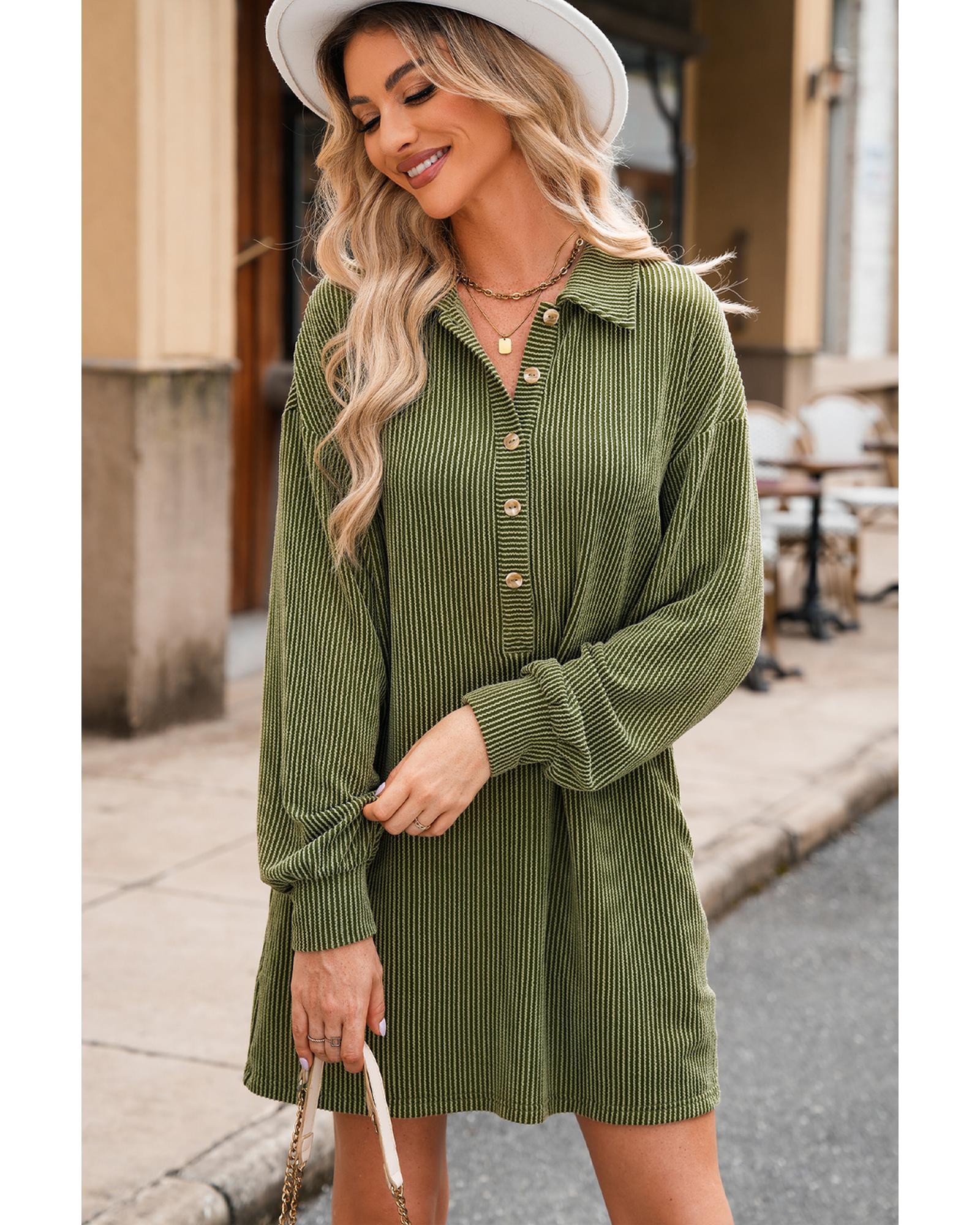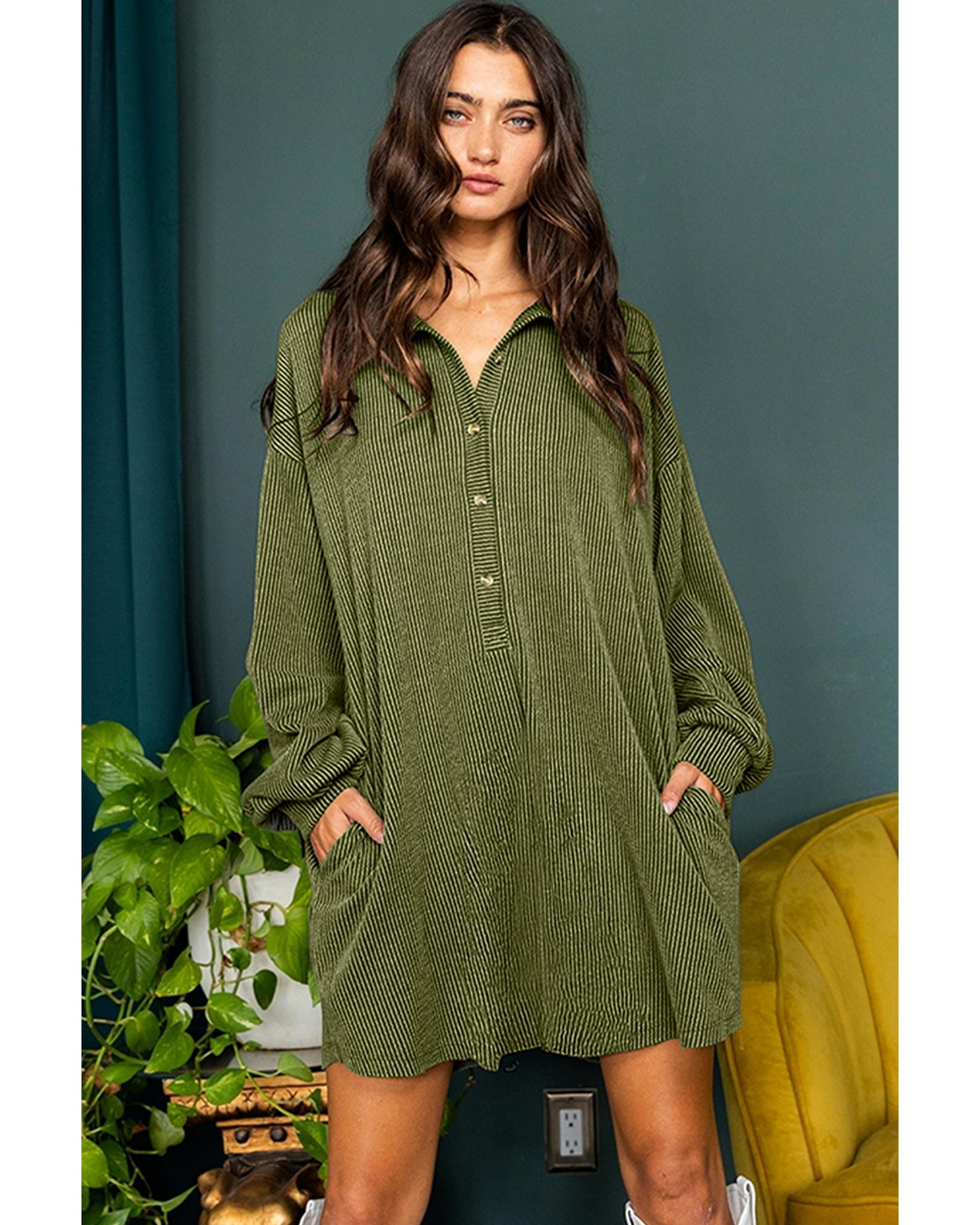 Moss Green Corded Buttons Placket Drop Shoulder Collared Shift Dress – L