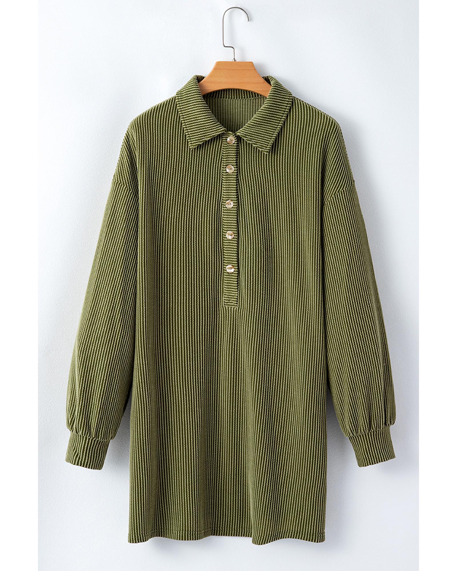Moss Green Corded Buttons Placket Drop Shoulder Collared Shift Dress – M