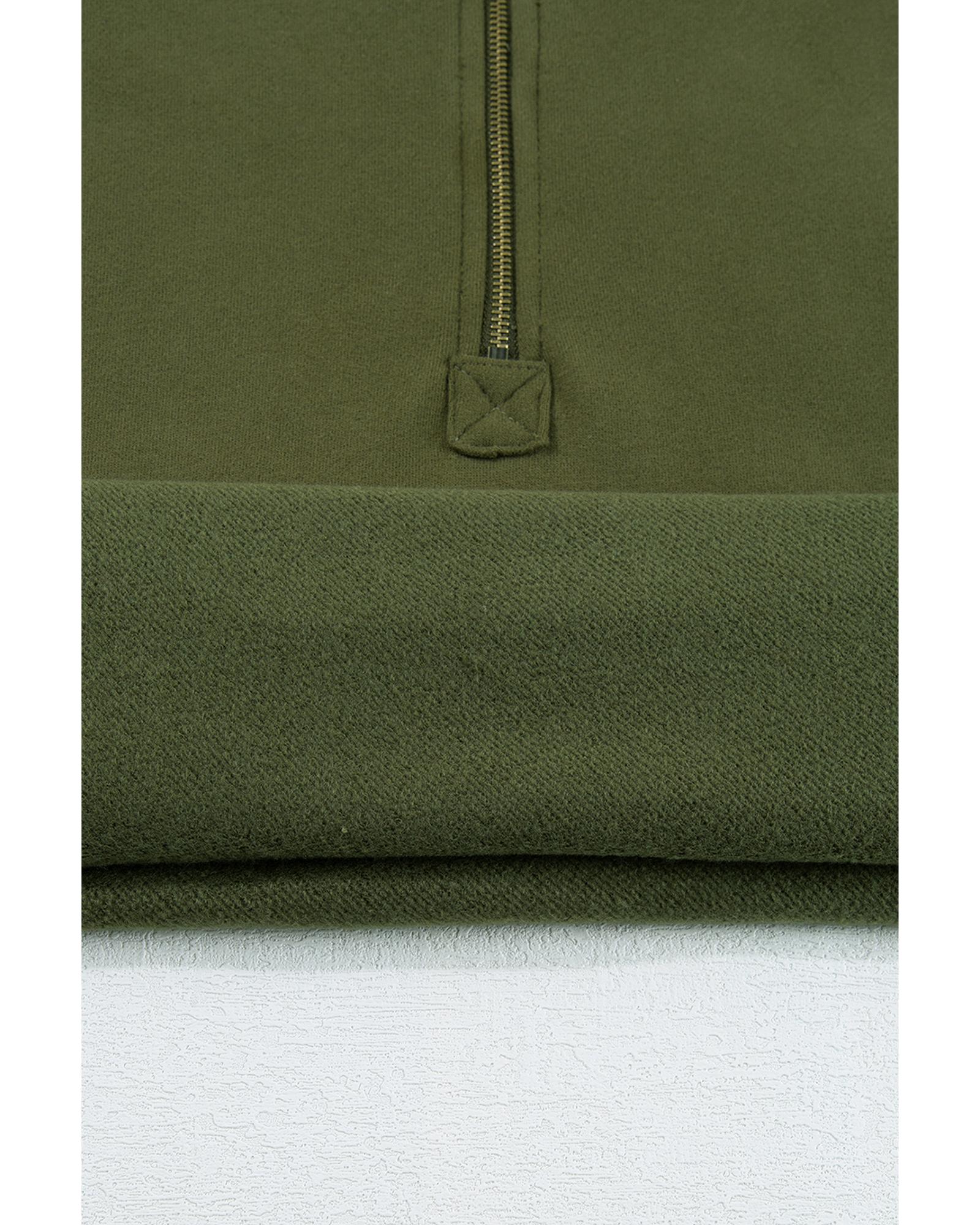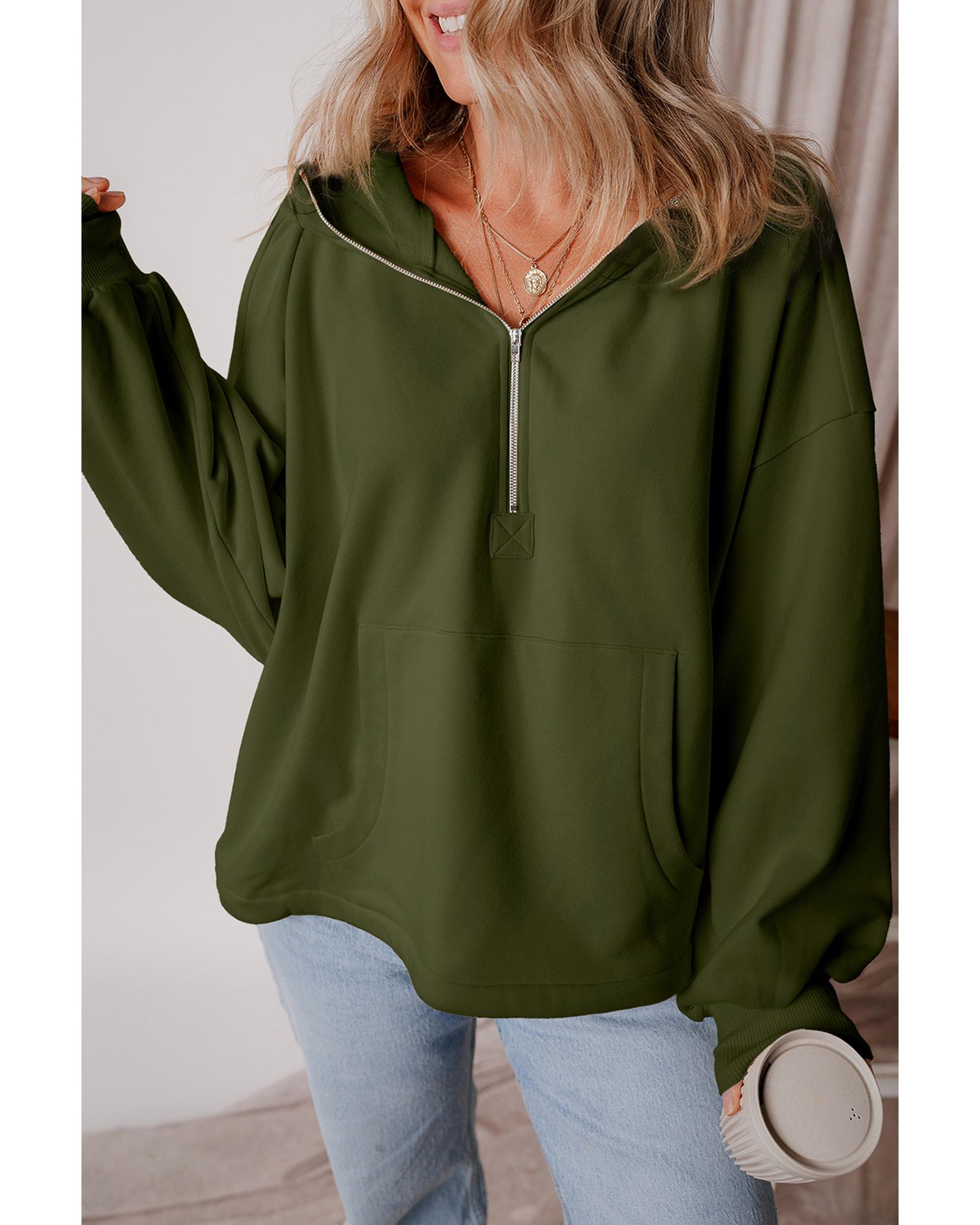 - Moss Green Fleece Lined Half Zipper Kangaroo Pockets Loose Hoodie