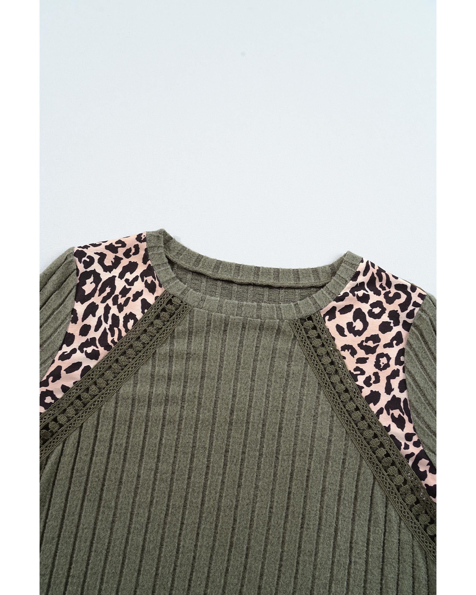 Moss Green Leopard Print Crochet Patchwork Rib Textured Knit Top – L