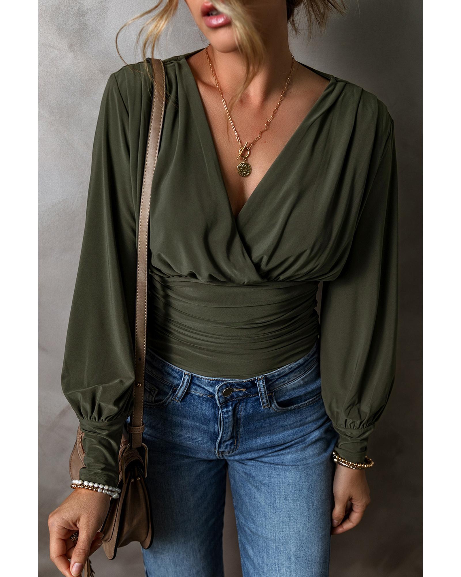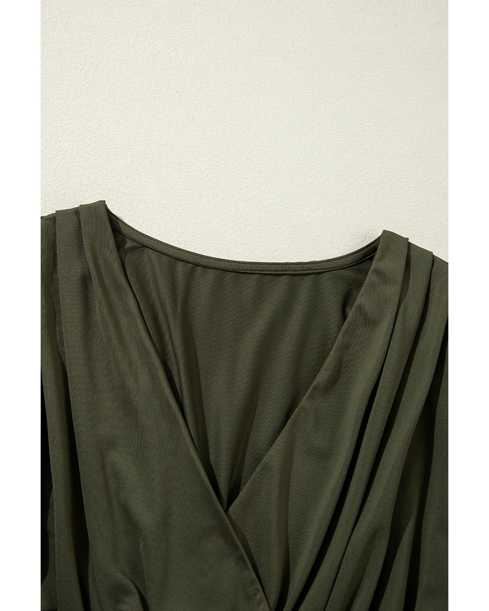 Moss Green Ruched Wrap V Neck Long Sleeve Bodysuit – XL