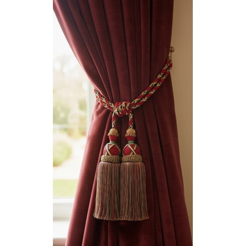 Elevate your window treatments with this exquisitely crafted decorative tassel tieback. The design boasts a luxurious palette of burgundy, green, blue gold threads. An intricately woven cord, featuring two decorative barrels adorned with a distinctive criss-cross pattern, seamlessly transitions into luxurious, silky fringed skirt tassels. This combination not only enhances the visual appeal of curtains but also introduces a tactile element of texture and refinement.