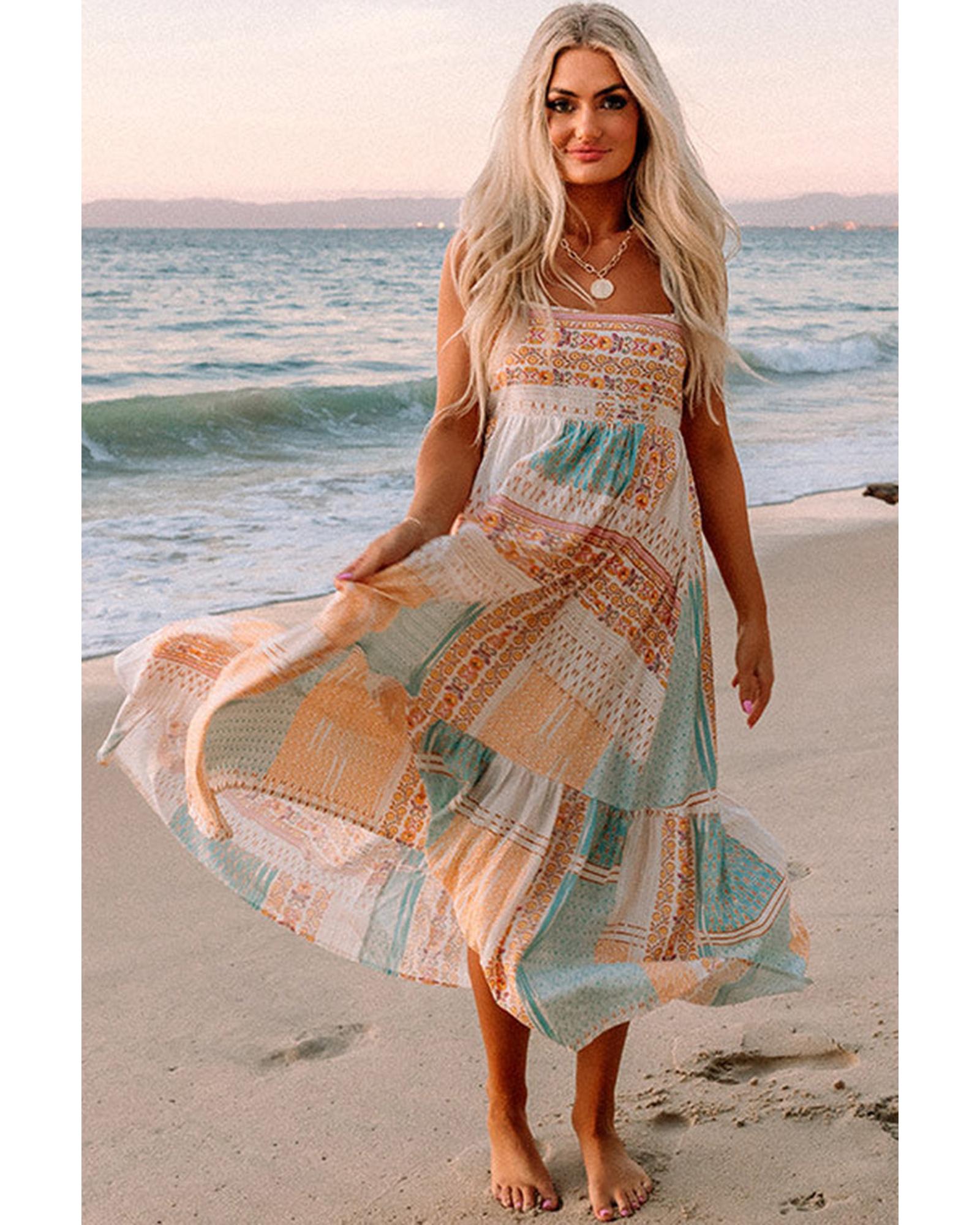 Multicolor Boho Patchwork Print Square Neck Sundress – XL