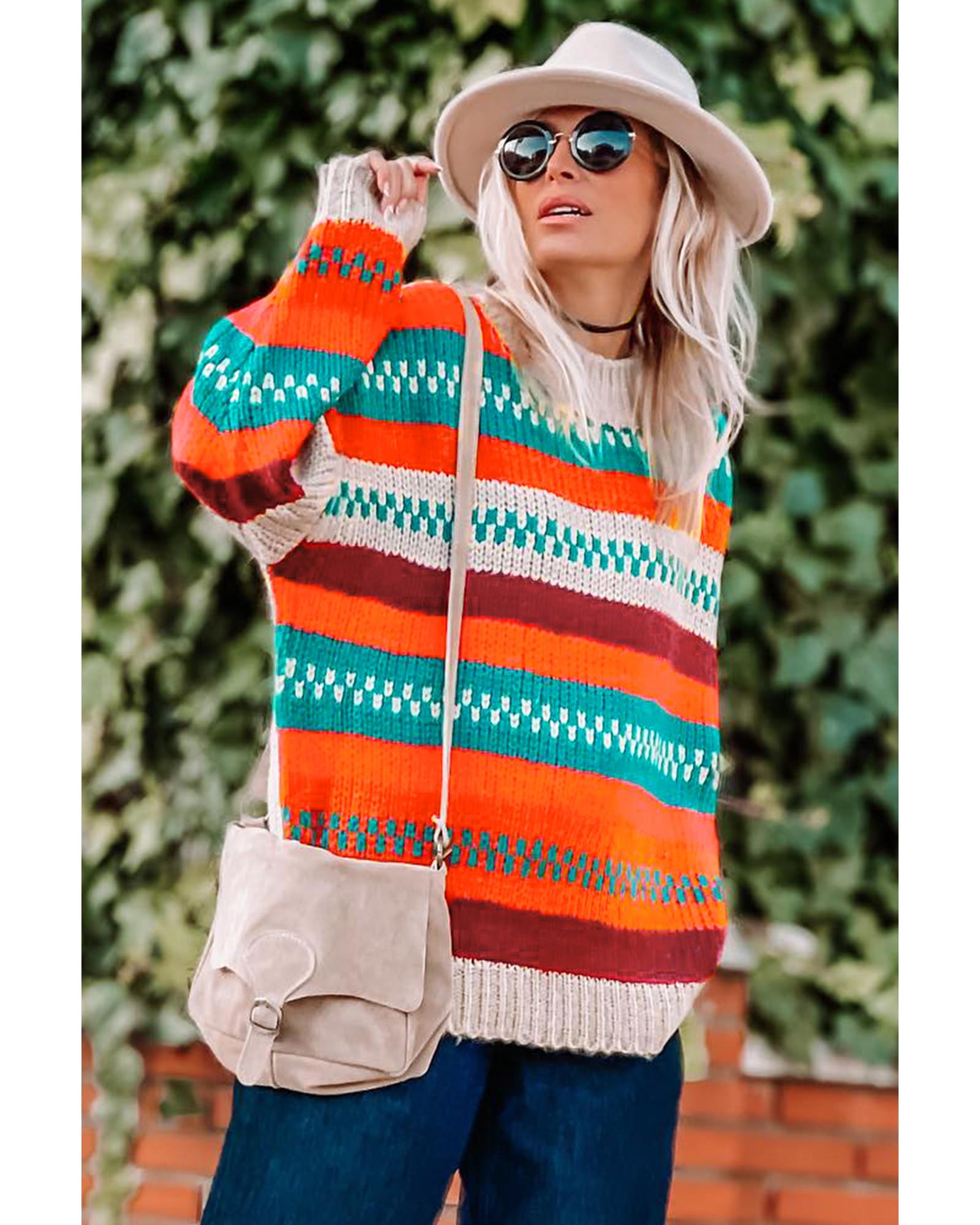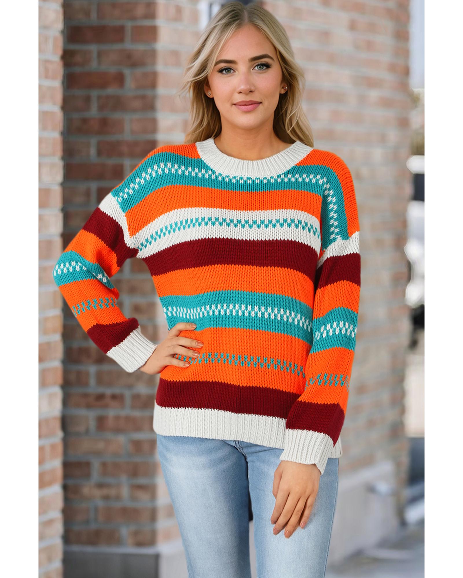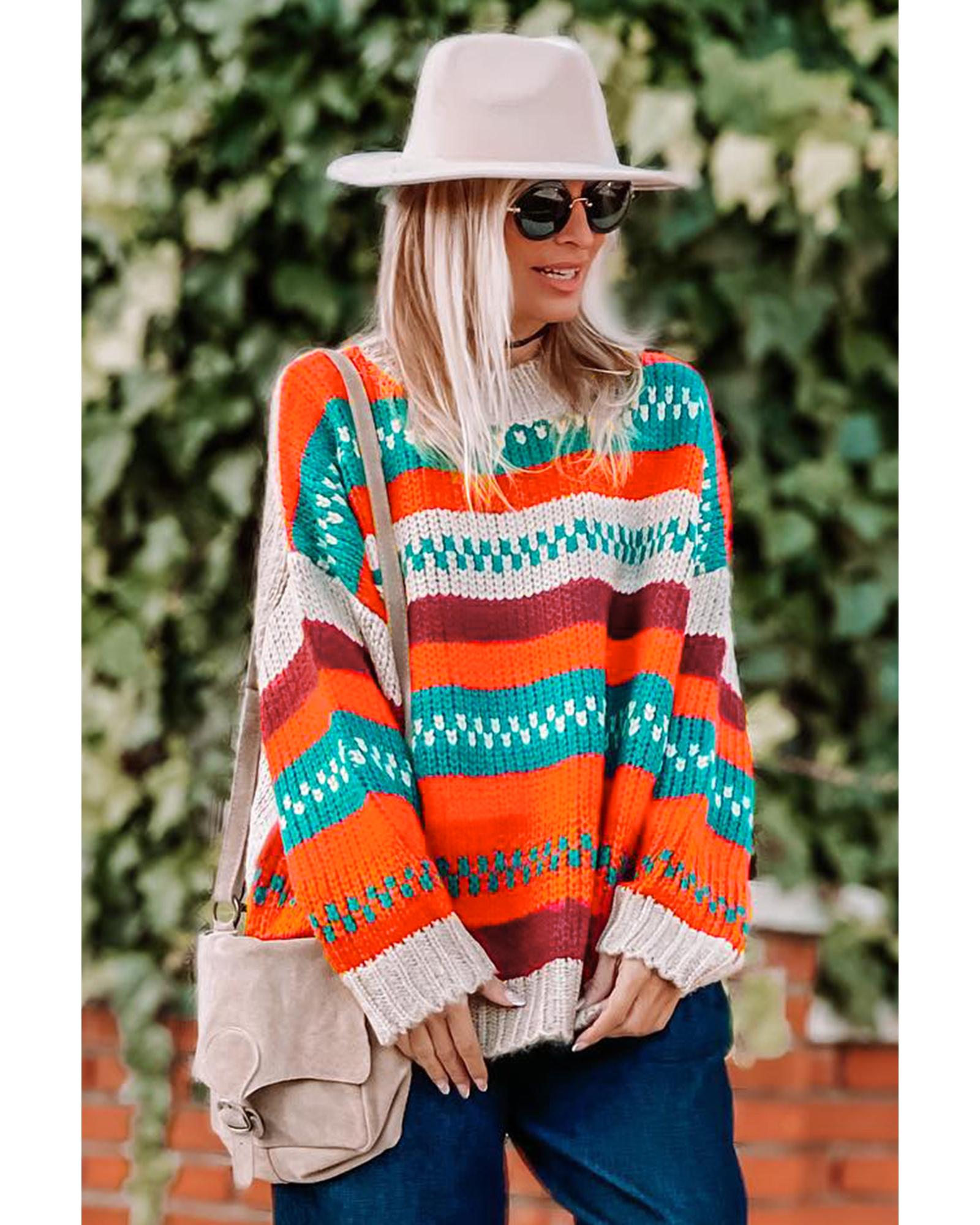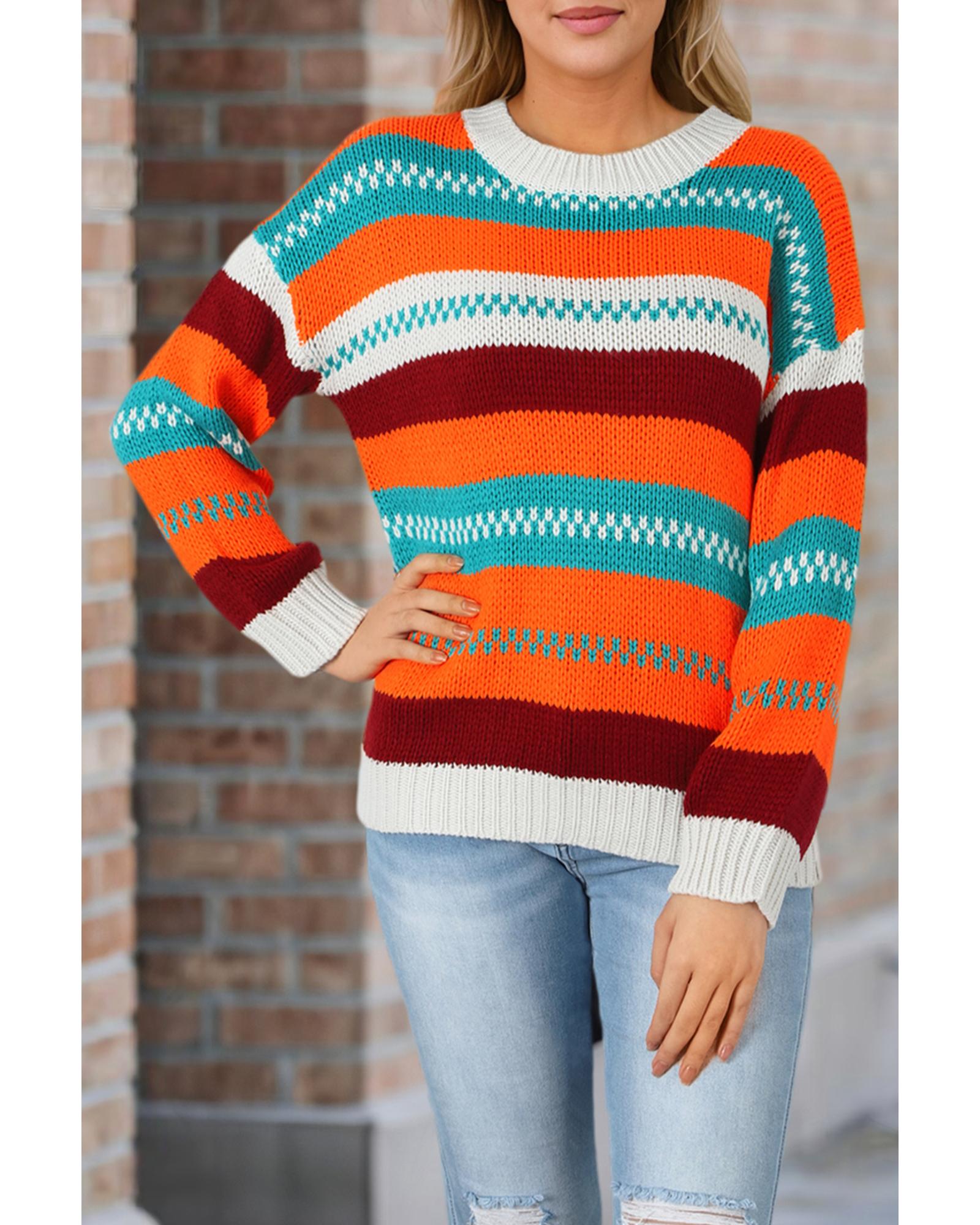 Multicolor Color Block Striped Loose Sleeve Sweater – M