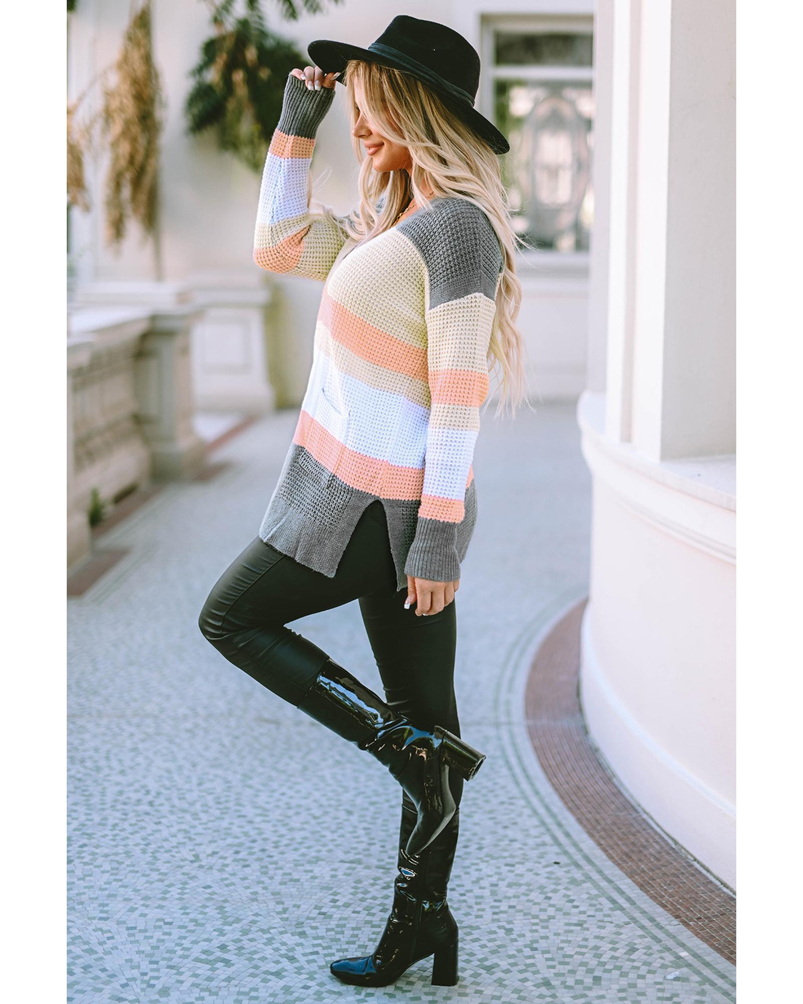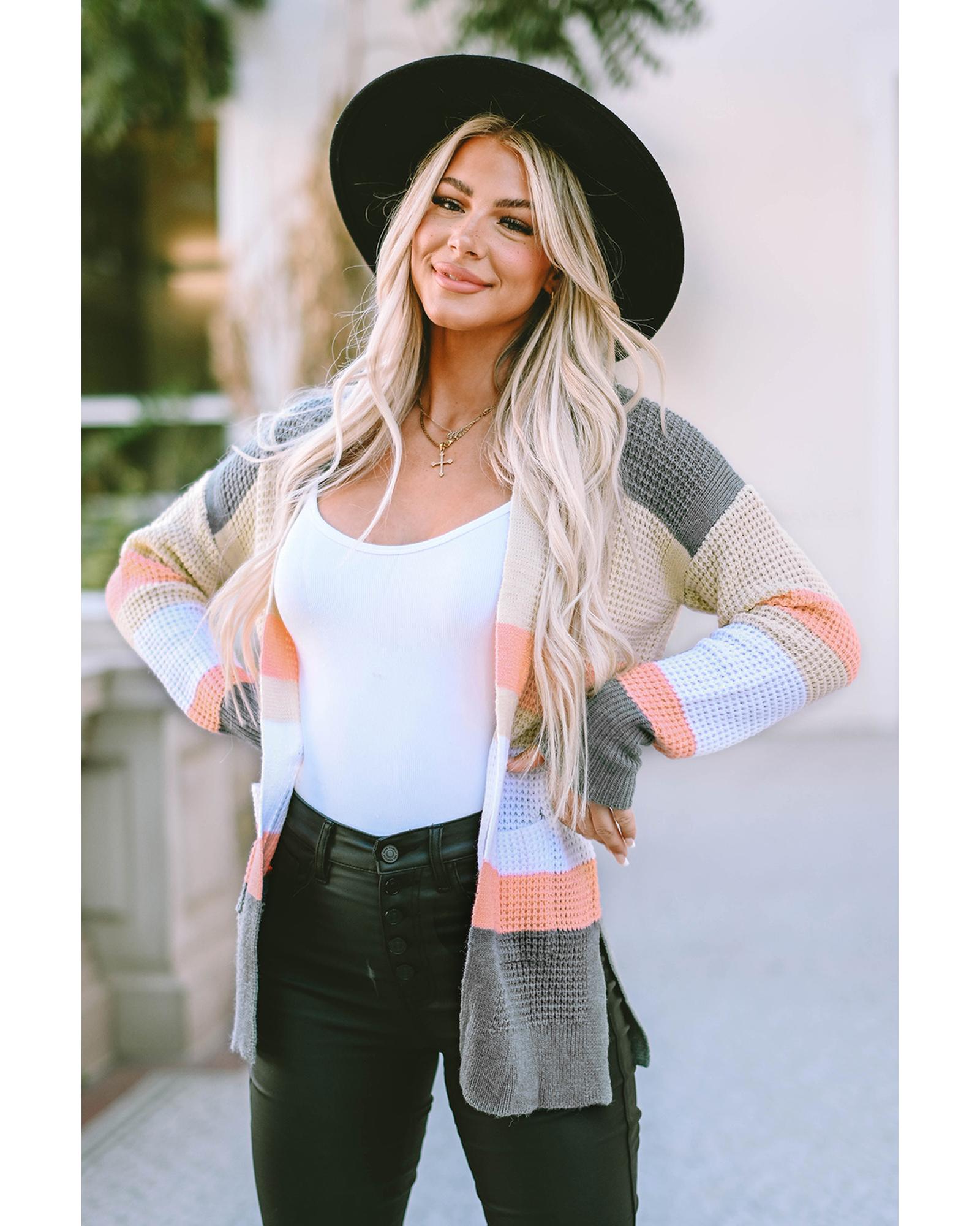 Multicolor color block striped design Open cardigan with pockets Perfect for winter season Pairs well with tops and jeans Fashionable and trendy Available for women - Material: 60% Acrylic 40% Polyamide