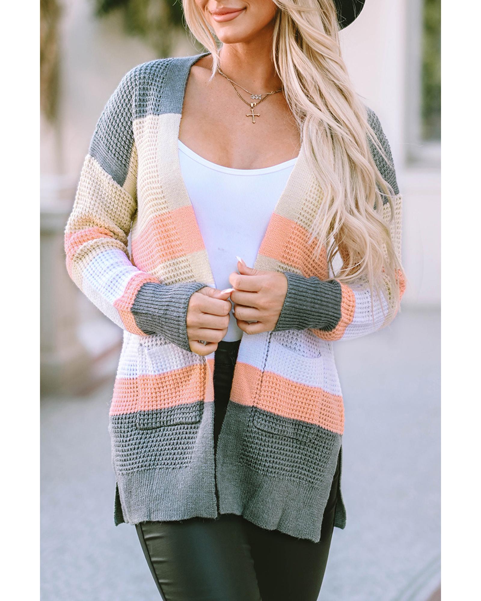 Multicolor Color Block Striped Pocketed Open Cardigan – XL