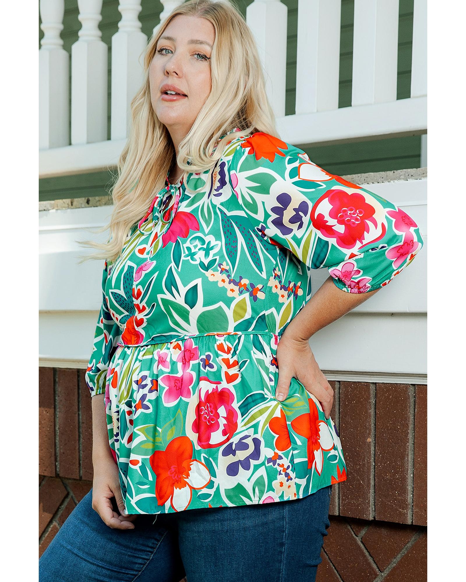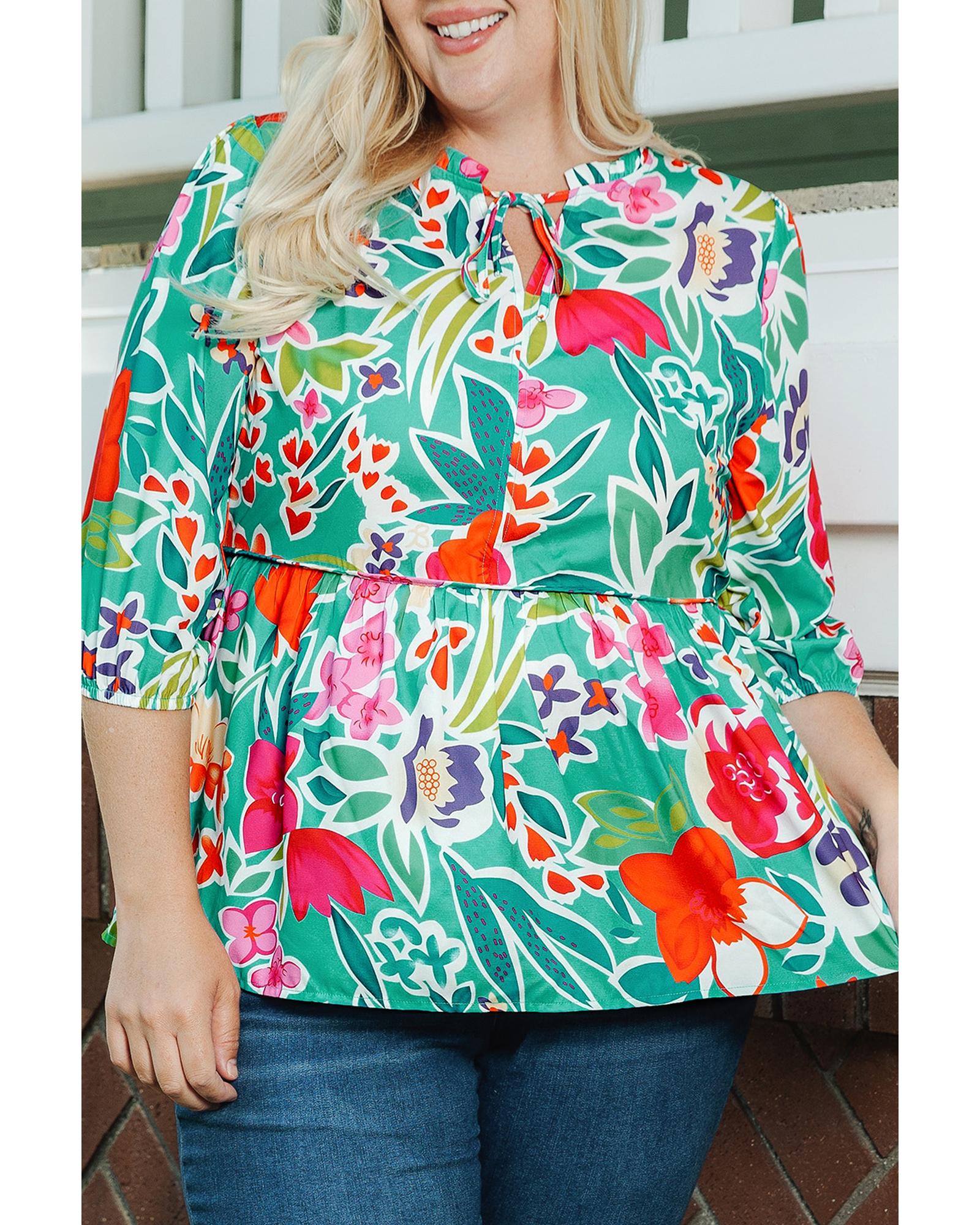 Multicolor Floral Tie Split Neck Plus Size Peplum Blouse – 1X