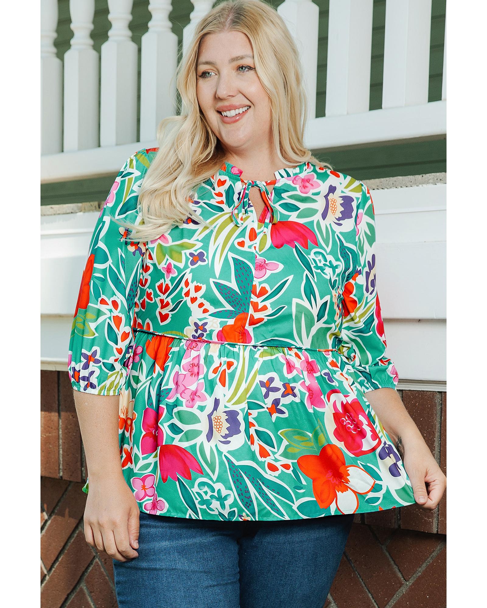 Multicolor Floral Tie Split Neck Plus Size Peplum Blouse – 2X